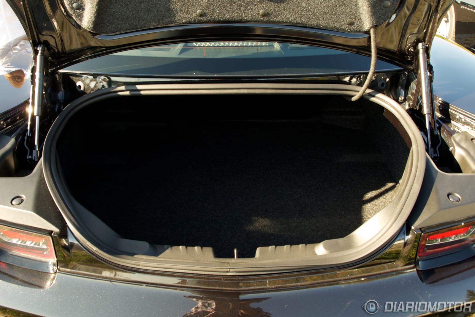Para el maletero tenemos una de cal y otra de arena. Si en la versión coupé del Chevrolet Camaro vamos a disfrutar de un espacio que parece interminable, en el Chevrolet Camaro Convertible la cosa está más complicada. Con la capota puesta, apenas queda hueco para un par de maletas de mano y hay mucho espacio debajo del techo de lona plegado que será difícil aprovechar, pero nunca nadie dijo que un convertible de corte clásico es algo cómodo y usable al 100%, así que nada que objetar en este sentido.
