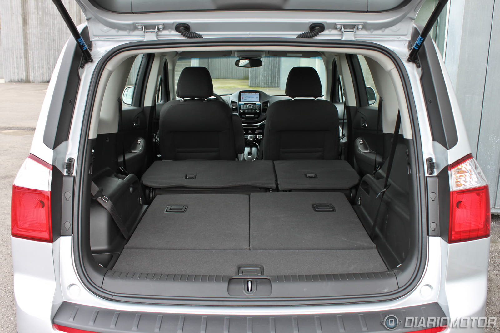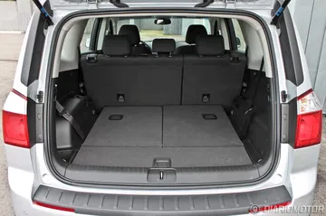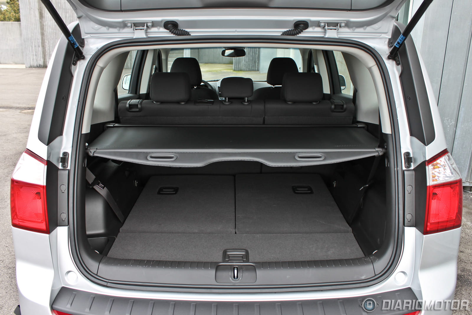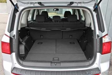 Disponemos de una cortinilla extensible para proteger la carga. Abatiendo la fila central de asientos se obtiene una superficie completamente plana de 1.500 litros, o 1,5 metros cúbicos que podemos usar para cargar grandes objetos en nuestras excursiones a Ikea. Con las tres filas en posición nos quedan sólo 90 litros de maletero, que no conviene cargar hasta el techo ya que no hay red que proteja a los objetos de salir despedidos en caso de frenazo o – Dios no lo quiera – un accidente.