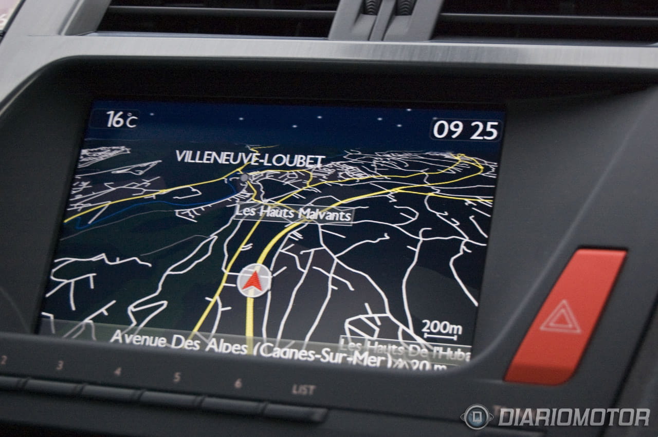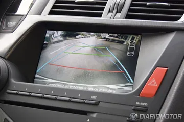 Por primera vez accionamos el contacto. Para ello basta con introducir la llave en una ranura y arrancar el motor mediante un botón situado en el salpicadero a la derecha del cuadro de mandos. Nada más iniciar la marcha nos percatamos de que, como era previsible, el diseño tan atrevido del Citroën DS5 sacrifica en gran medida la visibilidad lateral y trasera. Para compensar la perdida de visión en el ángulo posterior se instaló una cámara de aparcamiento trasera tan práctica como necesaria.