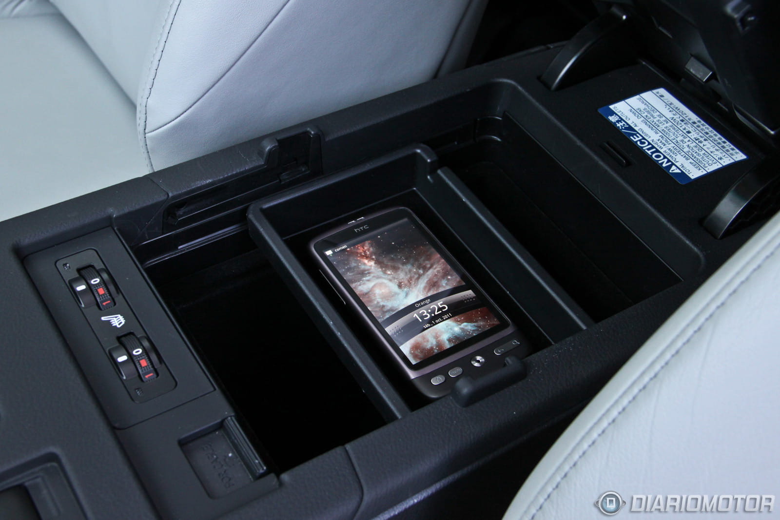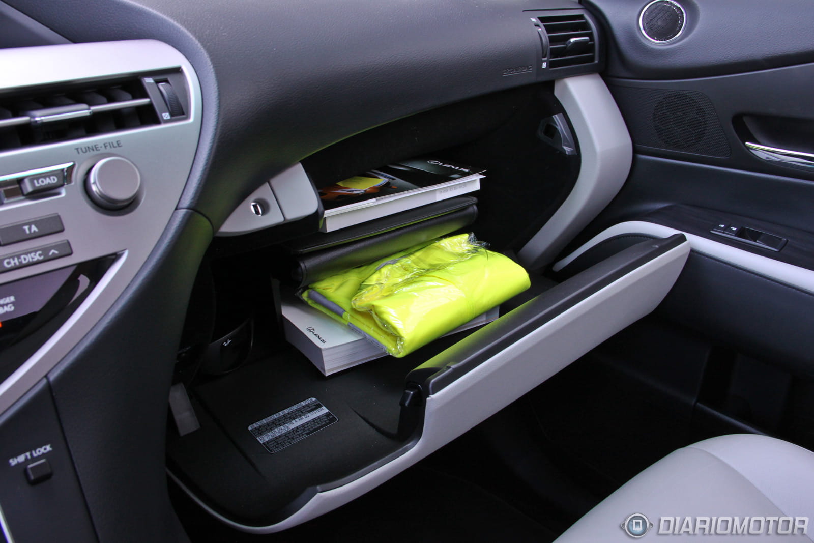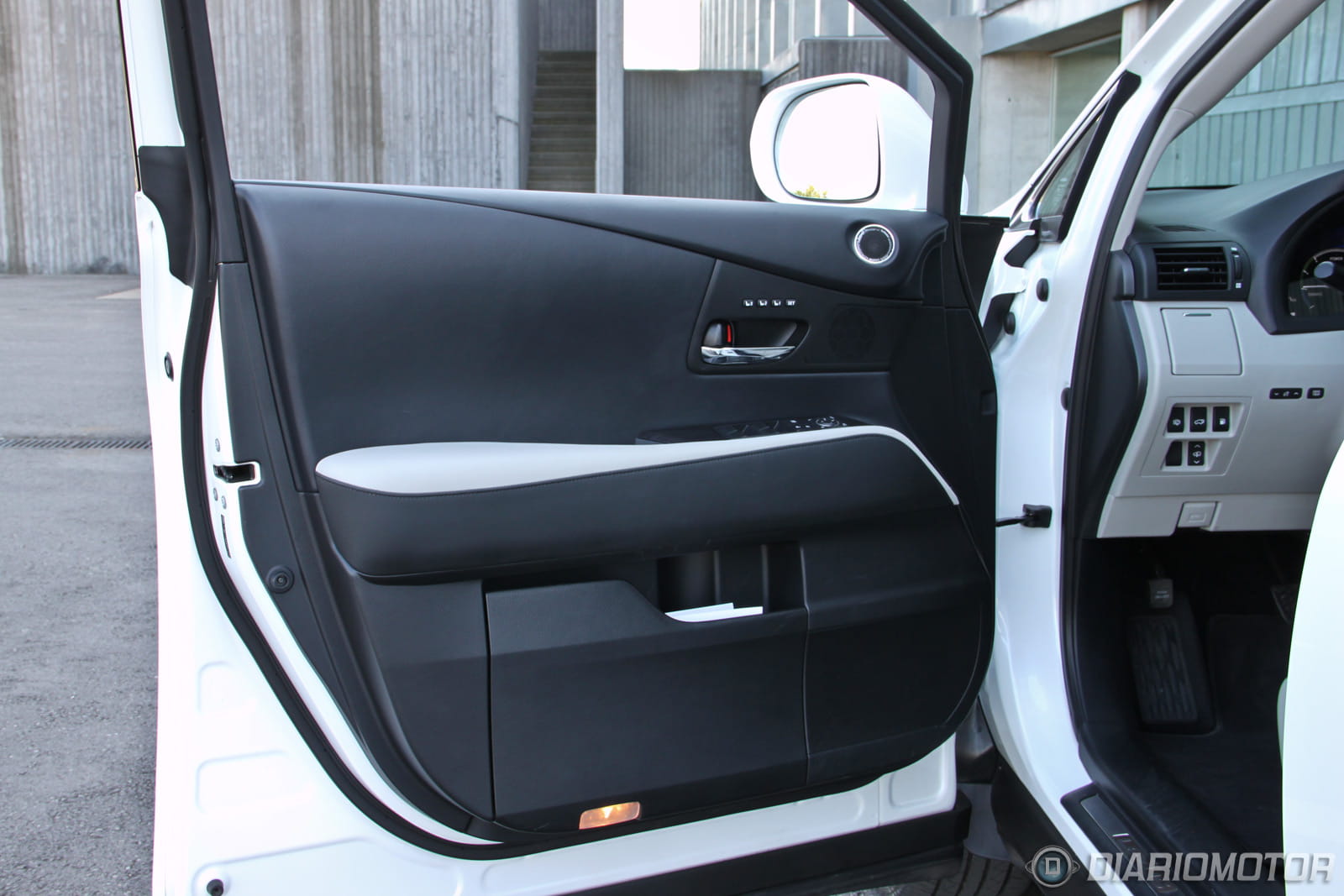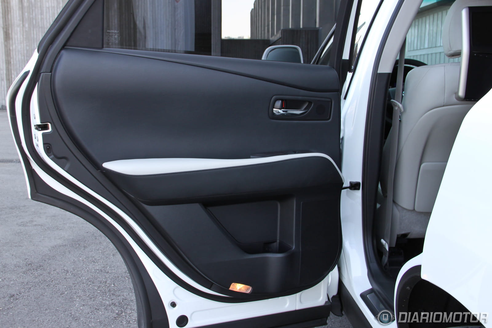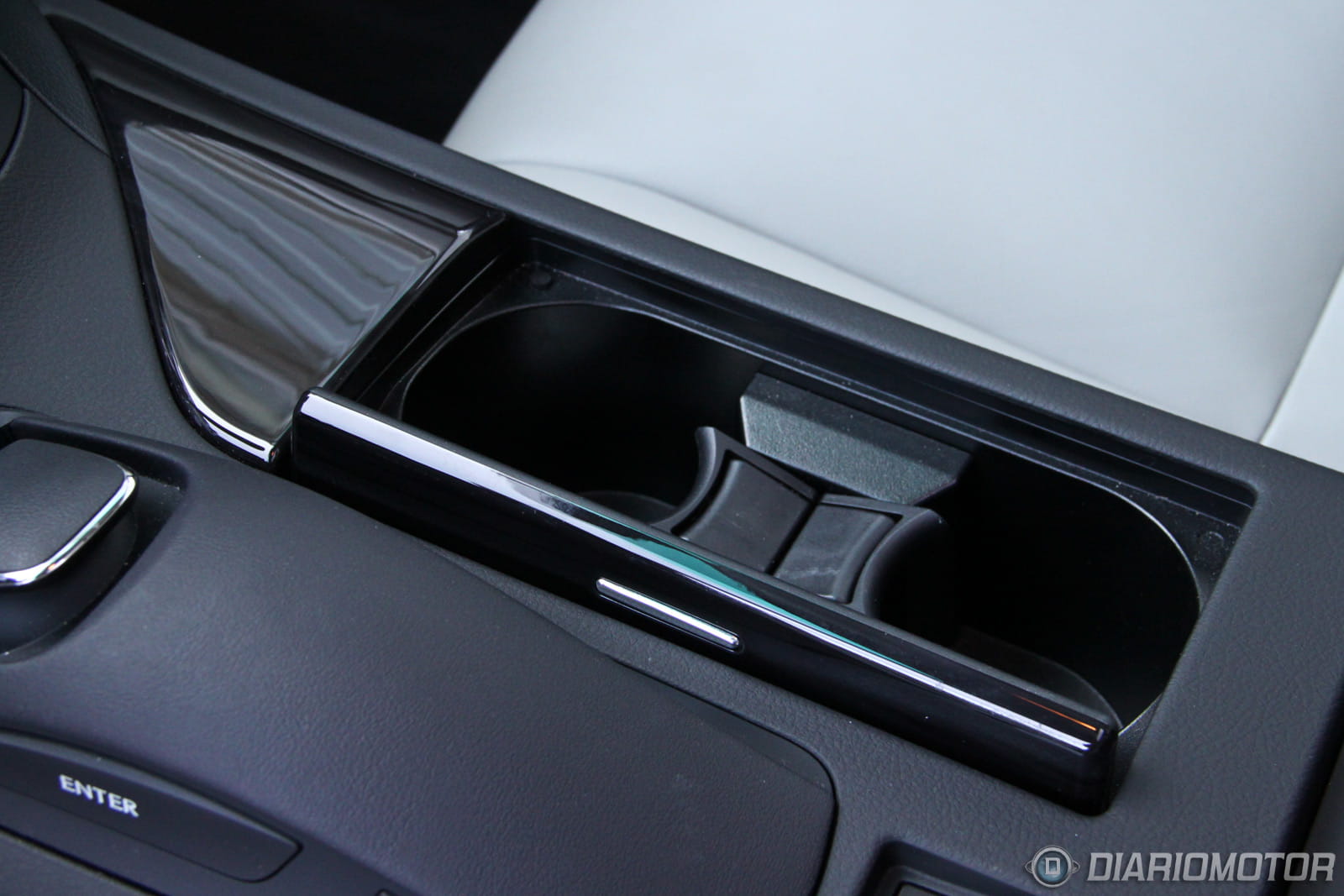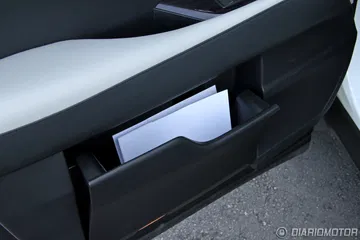 Dejando a un lado estos detalles, el Lexus RX 450h destaca también en practicidad. Bajo la consola central hay un enorme espacio en el que he almacenado una botella de agua grande pero que es por ejemplo ideal para un bolso de mujer, y no precisamente pequeño. El hueco portaobjetos de las puertas delanteras es pequeño, pero tiene una puerta abatible que permite un acceso excelente a los objetos que hayamos depositado, como un libro, revista o documentos varios.