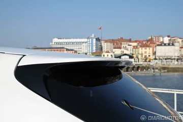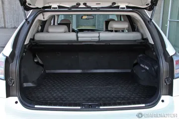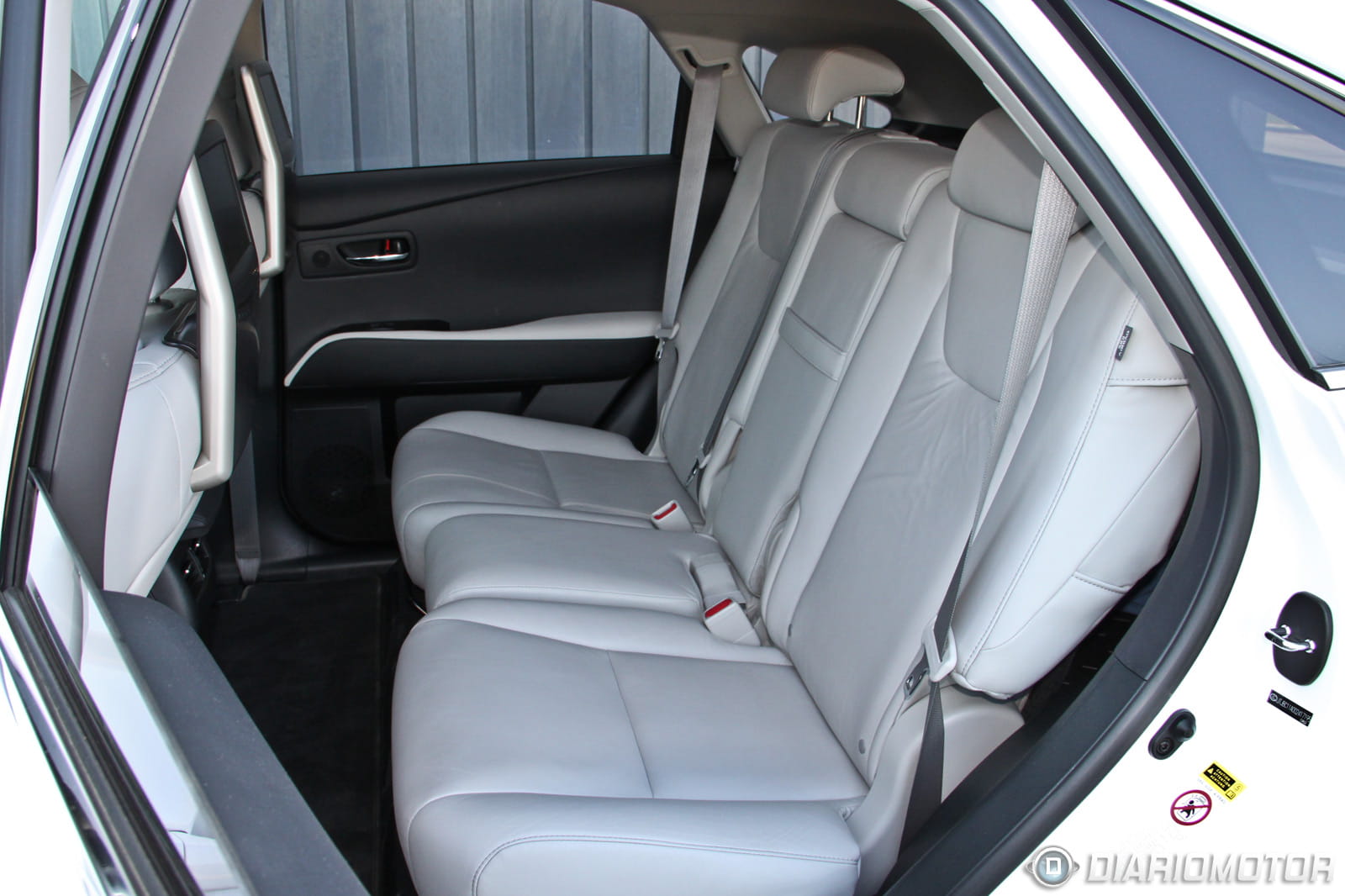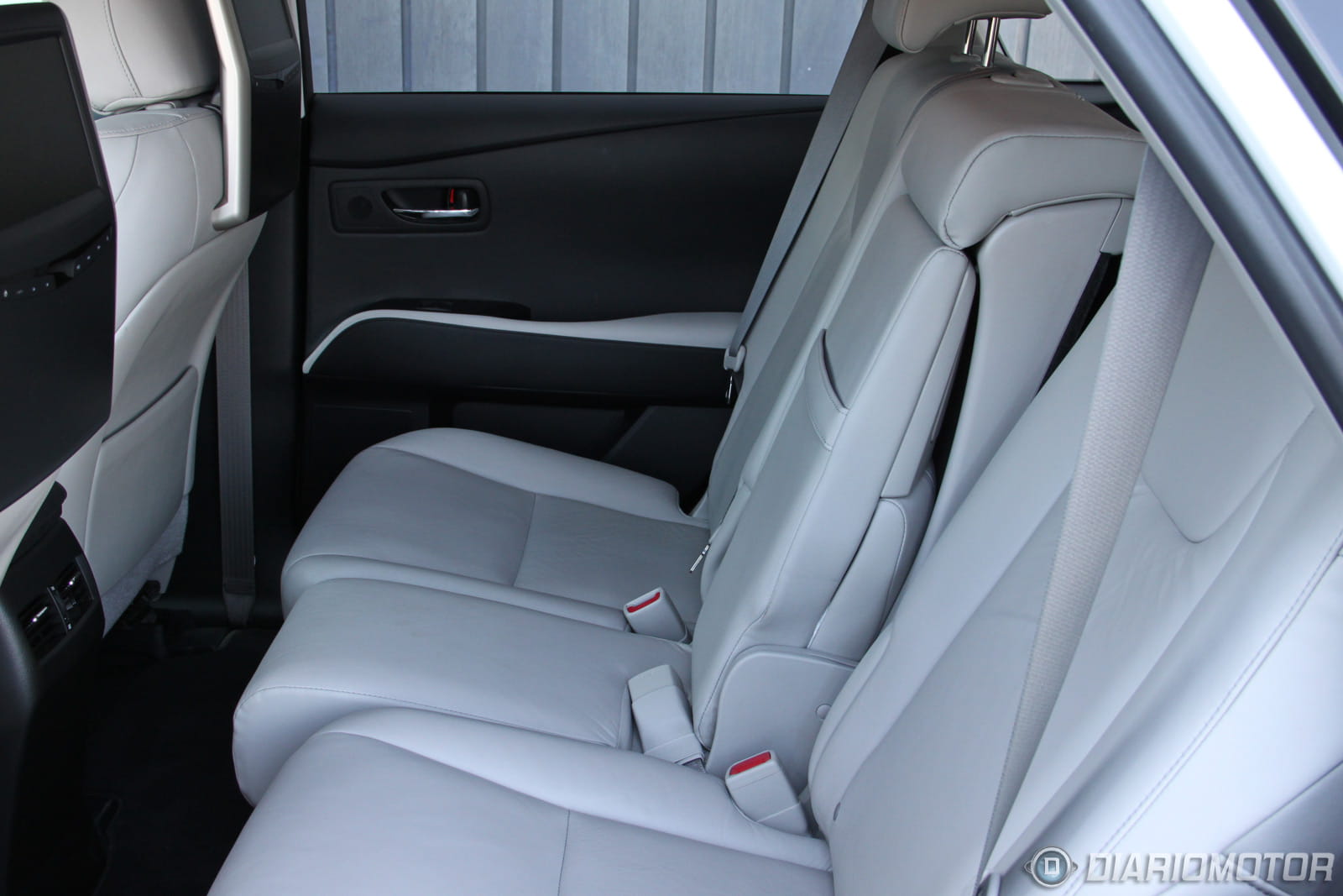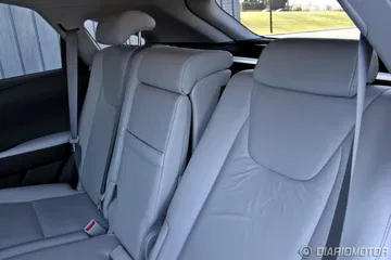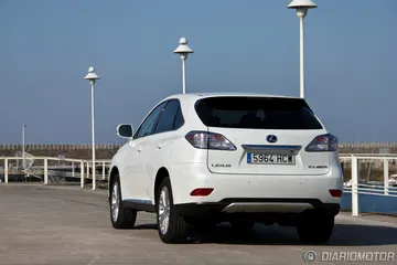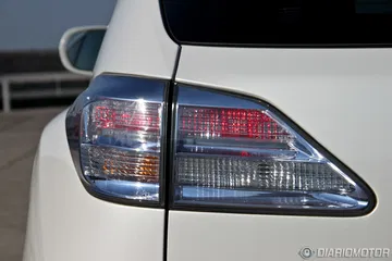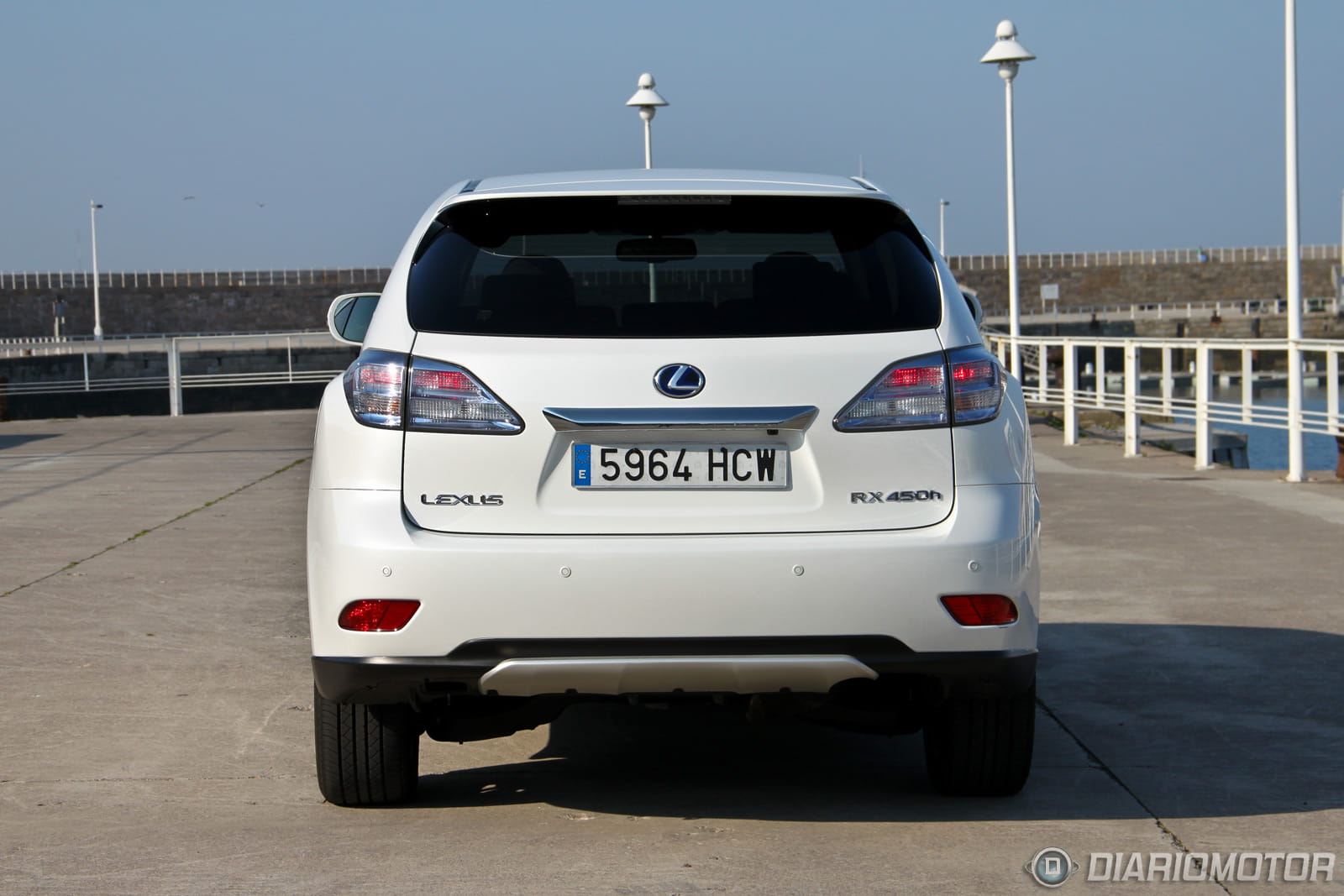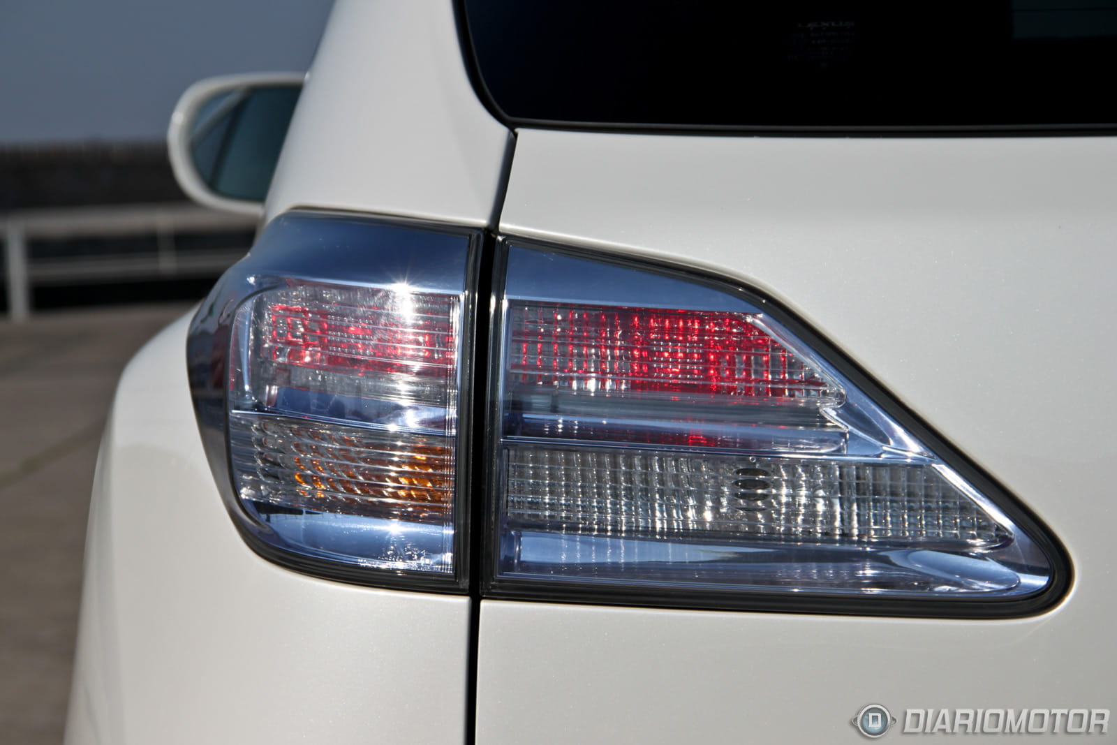 La zaga es grande, sencilla y cuadriculada, con enormes ópticas transparentes y una total ausencia de elementos como una salida de escape. Una curiosidad, el limpiaparabrisas trasero se esconde bajo el spoiler, siendo totalmente invisible cuando no se está empleando. El emblema “RX 450h” del portón y una chapita que reza “Hybrid” bajo la puerta trasera nos recuerda la vocación eficiente y tecnológica del SUV. A pesar de las dimensiones del coche, su coeficiente aerodinámico es de sólo 0,33.