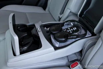 La guantera está refrigerada, tapizada e iluminada y es también grande. Entre ambos asientos hay dos portabebidas – bajo una elegante tapa satinada – y un enorme cajón bajo el reposabrazos. Este cajón es desmontable, sólo al sacarlo podemos acceder a las conexiones auxiliares del equipo de audio, desvelando un espacio aún mayor en el que literalmente cabrían dos o tres botellas de agua grandes: es ingente. No obstante, es un proceso engorroso para “pinchar” un simple USB con música.