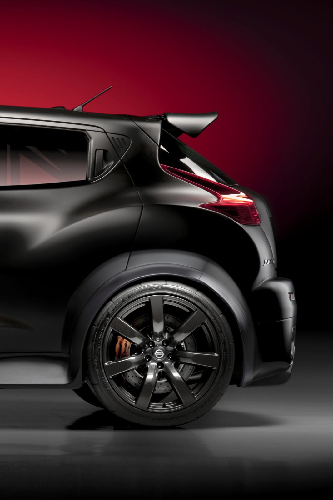Mucho ojo a esas llantas. Por que efectivamente bajo los sobredimensionados pasos de rueda de este Nissan Juke-R moran unas llantas de aleación forjada RAYS también del propio Nissan GT-R.