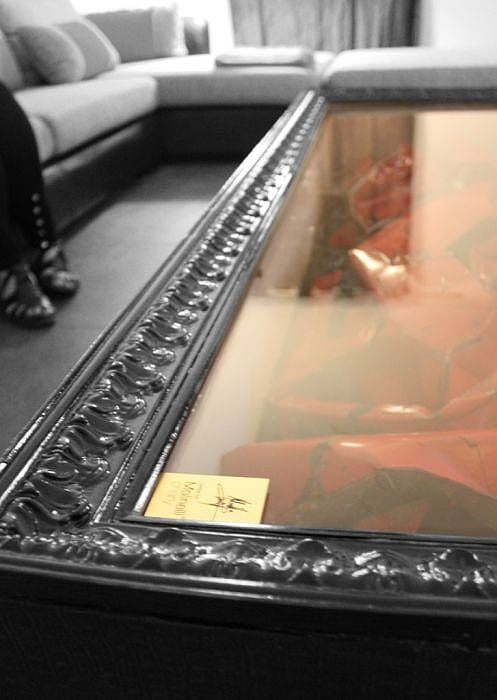 Una buena forma de reciclar de manera muy sencilla: insertar un Ferrari 360 Modena siniestrado (o al menos parte de él) en una caja de madera, tras prensar la chatarra y convertirla en un cubito de metal. Después, sólo te falta adornar la caja exteriormente con materiales aparentes, una vidriera transparente por encima, permitiendo apreciar el espectáculo, y voilà, he aquí una mesa reciclada para el salón de tu casa.