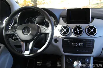 Los materiales empleados ofrecen un buen tacto, especialmente en cuanto a la piel del volante (en este caso, multifunción de doble grupo de botones) o a la palanca de cambios que conjunta un toque cromado junto al cuero. Otros botones como los del climatizador, la radio o los ajustes de los retrovisores tienen un “sabor” más a plástico. La iluminación del cuadro de instrumentos es blanca sobre negro al igual que las distintas velocidades o revoluciones. En el equipamiento de este Clase B también se incluían el pedalier de aluminio con gomas, algo que personalmente no me encaja en la filosofía de este coche.