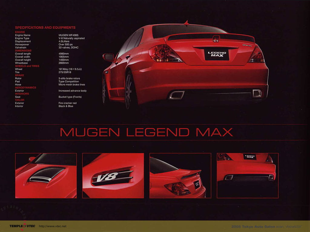 De vez en cuanto nos damos de bruces con obras maestras desconocidas como la que os mostramos hoy. En 2005 – y apoyando con el lanzamiento del Honda Legend en 2004 – Mugen mostró al mundo un prototipo de lo más brutal. Un ejemplar único que nunca encontró hueco en producción, pero que aún acelera nuestro pulso seis años después de presentarse. Hablamos del Mugen Legend Max, una berlina deportiva cuyo corazón es un motor 4.0 V8 de competición, con más de 500 CV de potencia.
