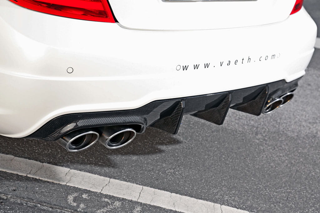 Yéndonos a las modificaciones realizadas en la carrocería del C63 AMG Coupé, destacan los nuevos paragolpes y aletas más anchas, que esconden una anchura que aumenta en 80 milímetros, así como spoilers, difusor trasero y parrilla frontal realizados en fibra de carbono. Y por último llegamos al tema precio: como os decíamos, es una preparación de bastante buen nivel y nada barata. 64.308 euros tendrían la culpa, y todo eso sin tener en cuenta el coste de un C63 AMG Coupé original ni los impuestos correspondientes…