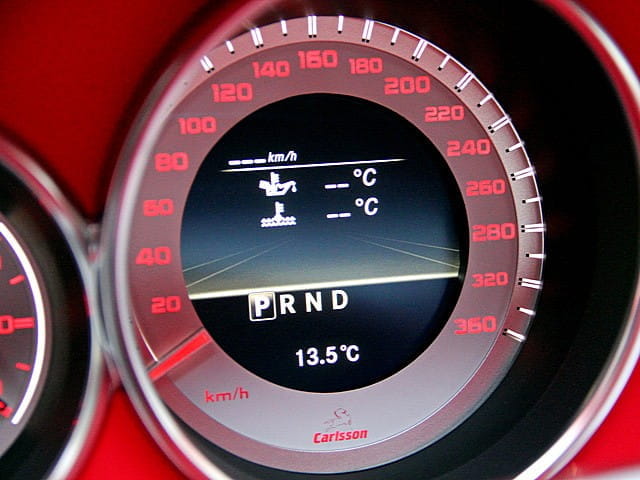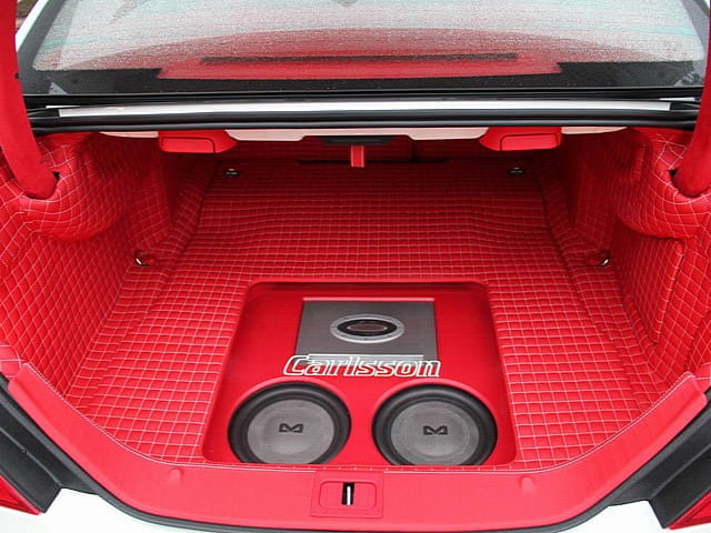 A primera vista puede resultar hasta atractivo según los gustos, pero estoy convencido de que utilizar un coche así a diario puede acabar derivando en trastornos psicológicos. Los materiales utilizados para el habitáculo son de alta calidad, la mayoría está tapizado en cuero nappa de color Santa Red que, como no podía ser de otra forma, cuenta con cosidos en color blanco. Incluso el maletero ha sido tapizado en color rojo, y en él nos podemos encontrar los subwoofers de un poderoso equipo de sonido instalado por Carlsson.