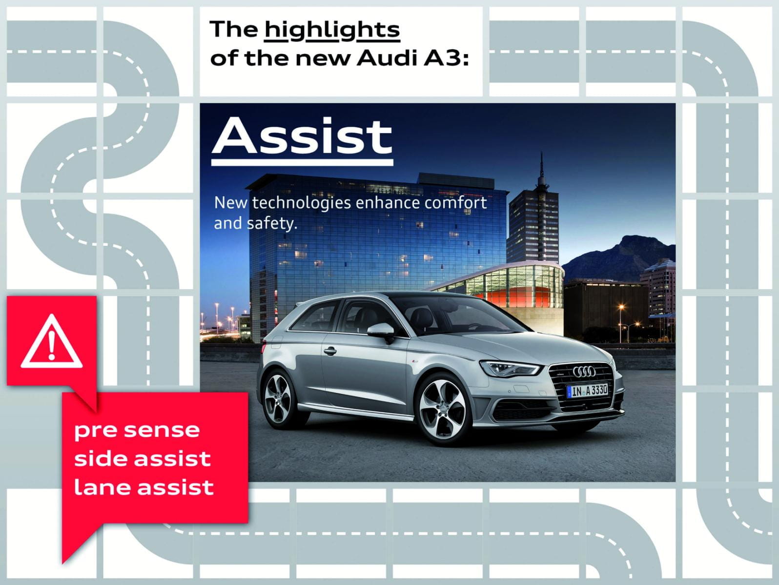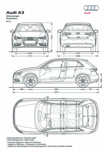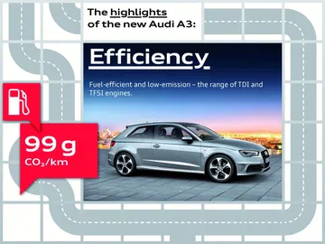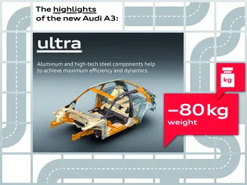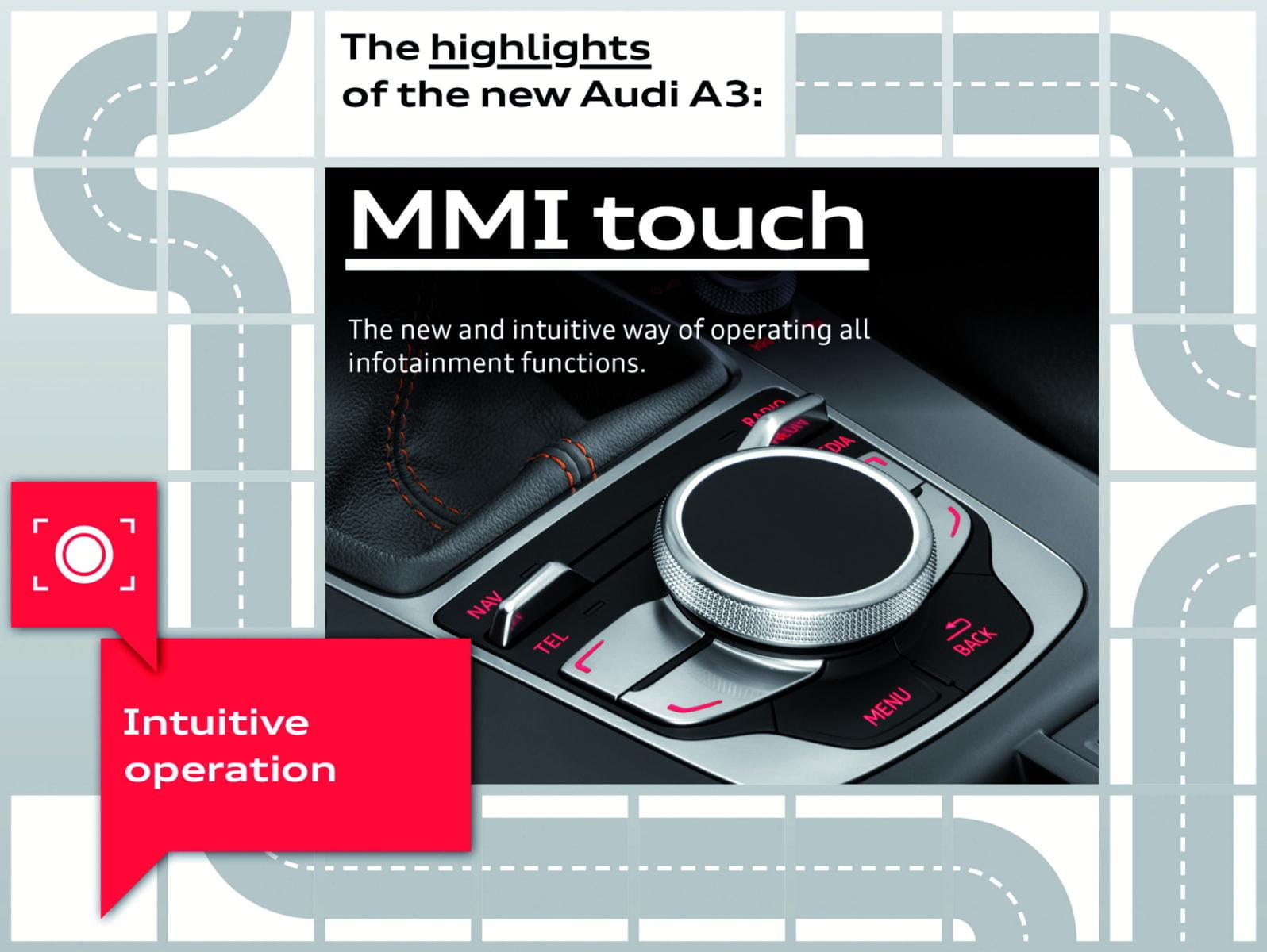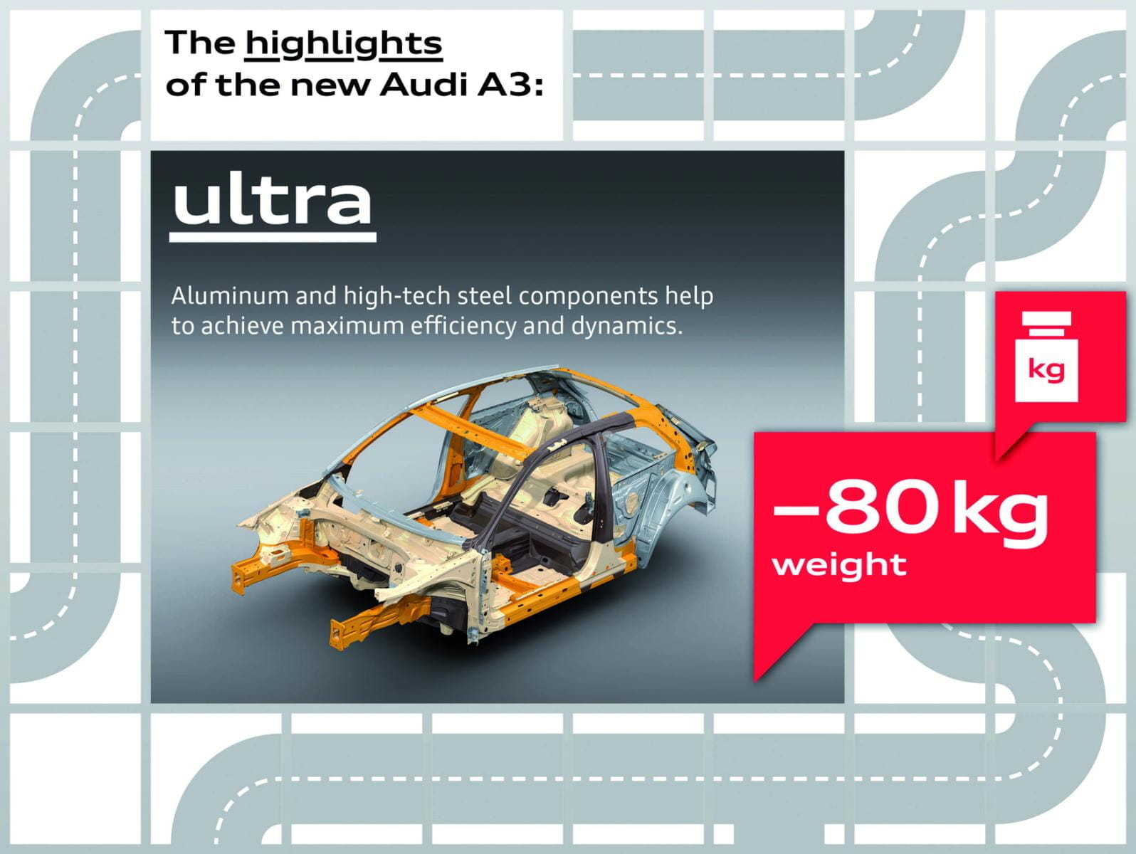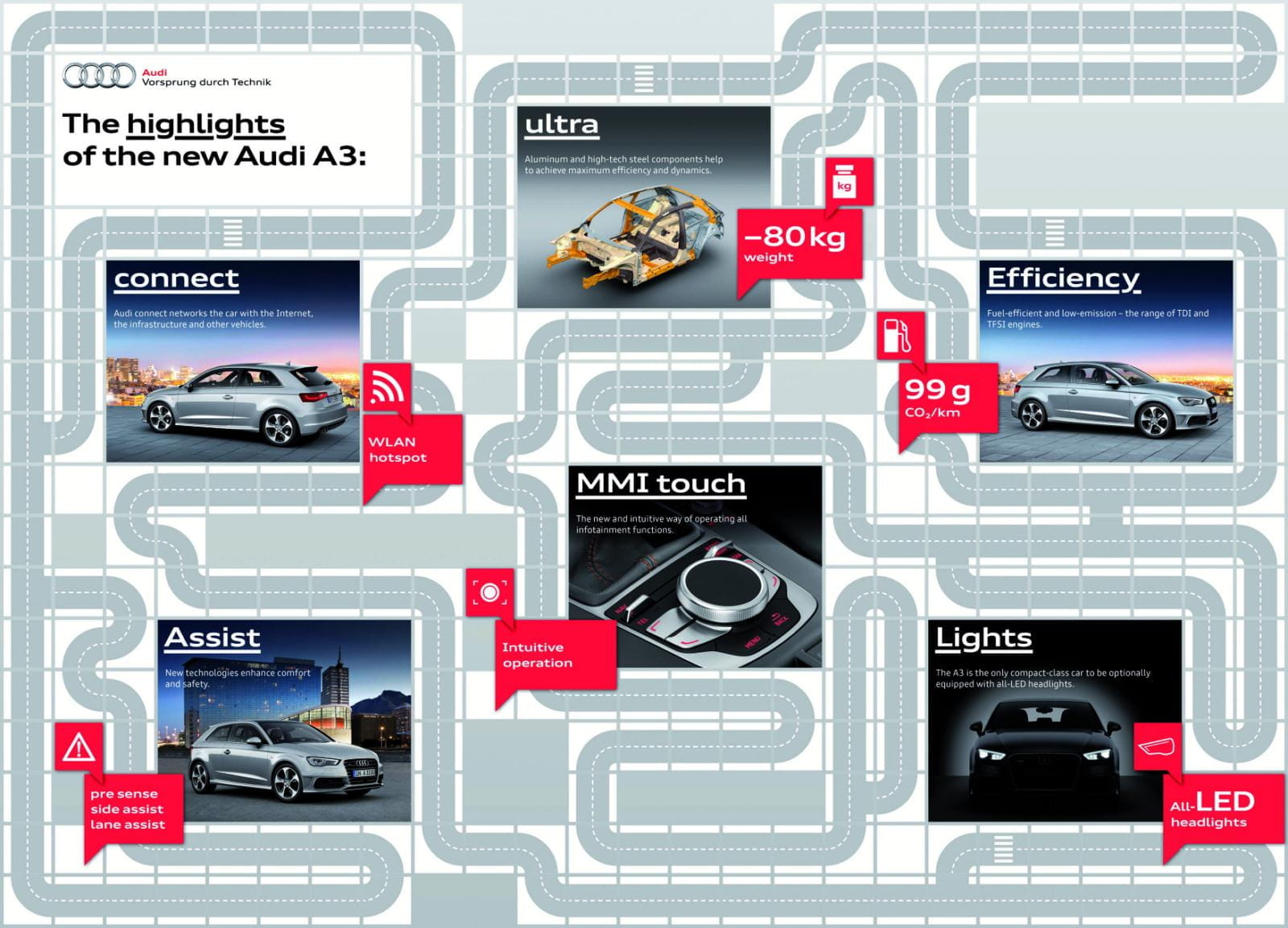 Las dimensiones crecen sólo muy ligeramente, quedándose en unos contenidos 4,24 metros de longitud, huyendo del gigantismo de algunos de los compactos actuales. Además, el peso no sólo no aumenta, sino que se reduce gracias al empleo de aluminio, a la nueva plataforma modular MQB y a estas dimensiones exteriores nada exageradas. También se mejora el rendimiento y eficiencia de su gama de motores, que de inicio estará compuesta por los 1.4 TFSI de 122 CV y 1.8 TFSI de 180 CV, así como el diésel 2.0 TDI, ahora con 150 CV. Pero sin duda donde aspira a triunfar el nuevo Audi A3 entre los compactos premium es en la elevada carga tecnológica, como con el nuevo sistema multimedia MMI.
