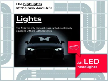 Tres serán los acabados del nuevo A3: Attraction, Ambition y Ambiente. Por supuesto, y como suele ser tradición, además habrá una amplísima lista de elementos opcionales, incluyendo control de crucero adaptativo, asistente de cambio de carril, asistentes de aparcamiento, suspensión deportiva (altura rebajada en 15 milímetros), iluminación LED interior, techo panorámico, asientos deportivos o iluminación dinámica con faros de xenón. También estarán disponibles multitud de elementos de personalización y deportivos, como el paquete S line. En lo relativo a seguridad, la mayor novedad es la aparición del airbag de rodilla, además de todos los elementos ya habituales.