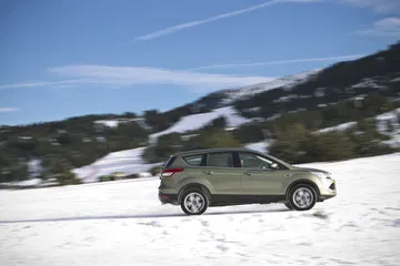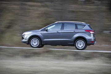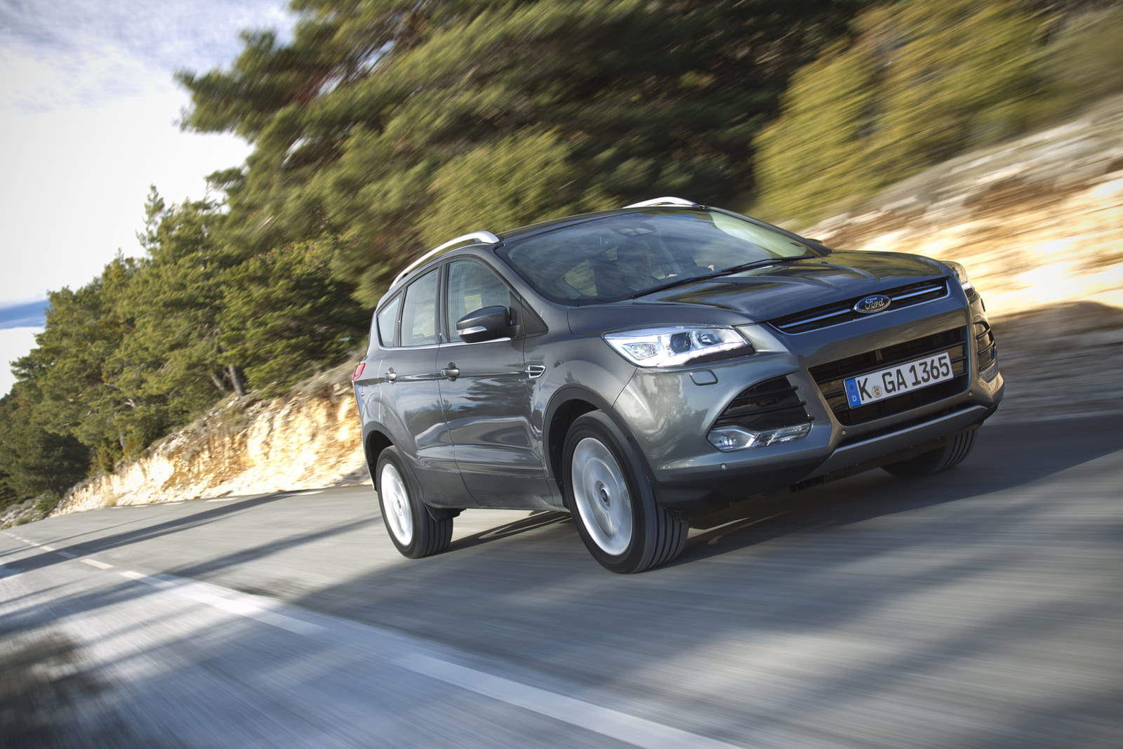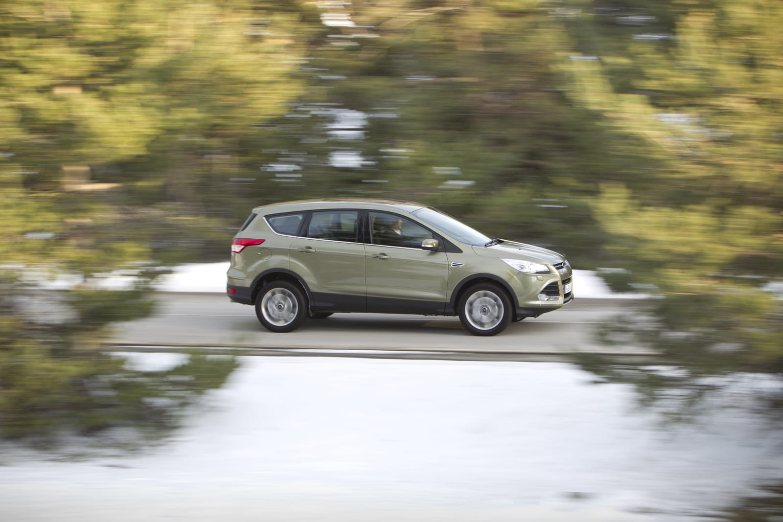 Vista lateral del Ford Kuga en movimiento, destacando su diseño aerodinámico y robusto.