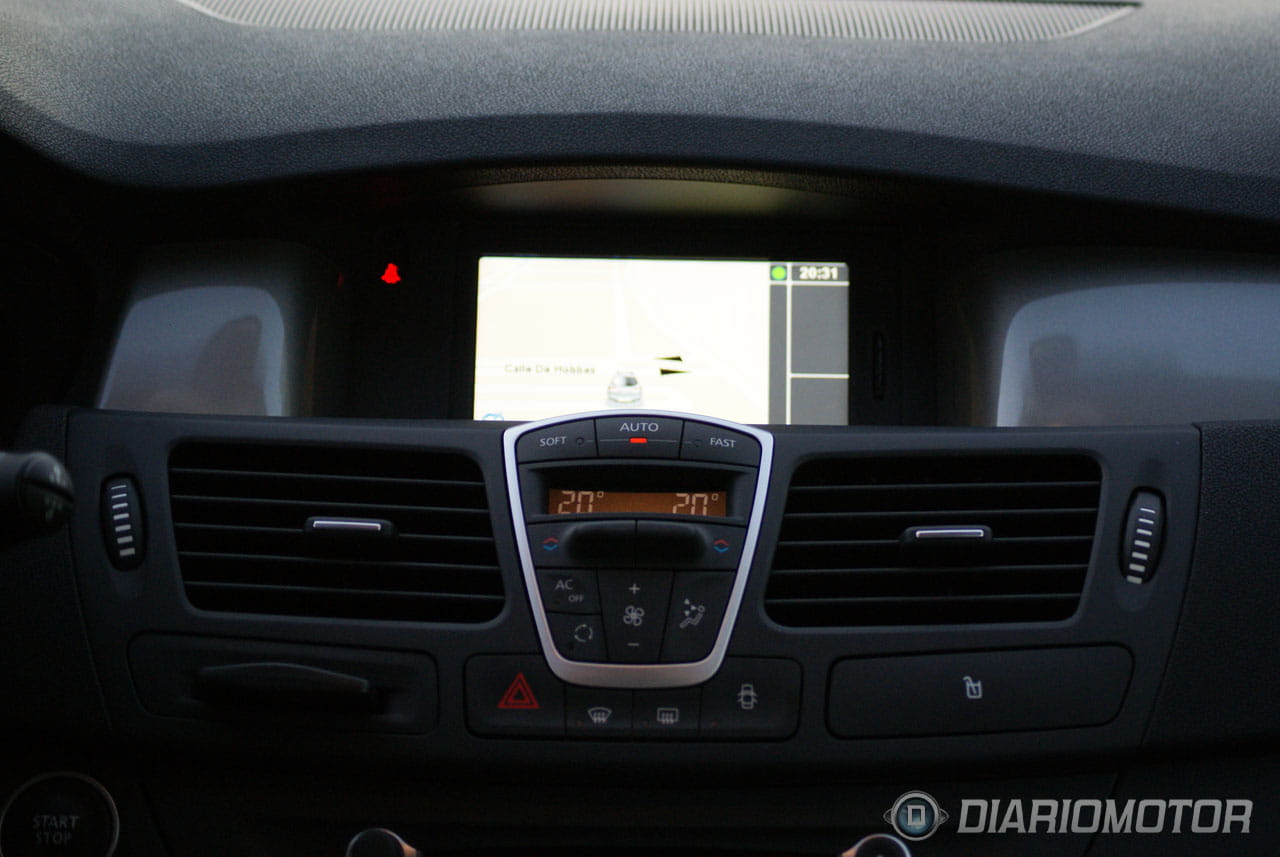 Justo encima se encuentran los controles del climatizador bizona, bastante simples pero efectivos. Hasta esta altura todo el salpicadero está compuesto por un plástico de algo mejor calidad que el de las puertas, y justo encima encontramos la pantalla multimedia del navegador, radio y demás embebida en un plástico gris clarito de suave tacto (pero se nota que es plástico), creando un buen contraste y espacio para la pantalla y para separar el material de la mitad inferior con el de la superior.