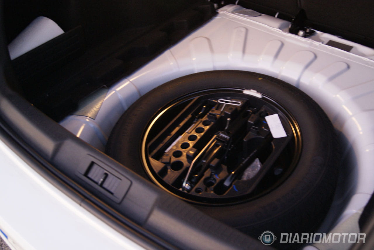 Con respecto al maletero, se pueden plegar los asientos traseros (en formato 2+1), ampliando el maletero desde los 450 litros iniciales hasta los 1.377 litros. Con este espacio creo que no tendremos excesivos problemas para guardar maletas o ir al Ikea. Debajo del suelo del maletero encontramos una rueda normal de repuesto sobre una llanta de las antiguas, y en el centro el gato y las herramientas para cambiarlas.