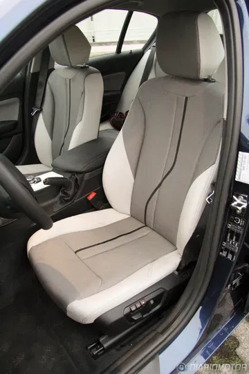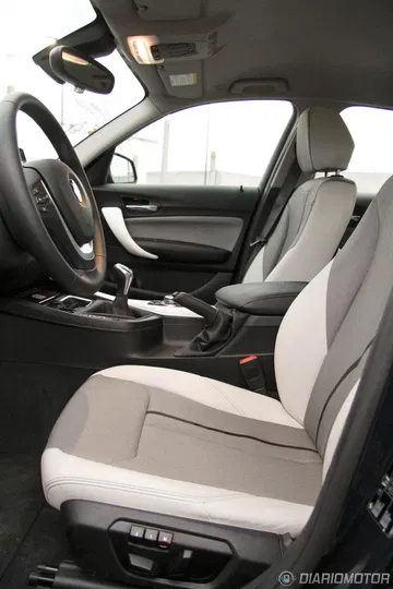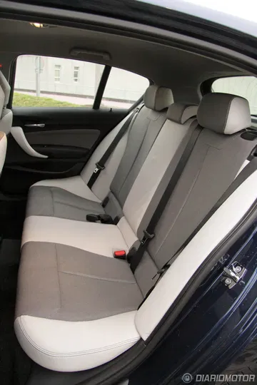 La tapicería del BMW Serie 1 Urban busca la elegancia mediante la combinación de tela gris y cuero blanco, además de inserciones de color blanco lacado a juego. El respaldo de los asientos nos da la impresión de que son bastante finos y poco envolventes, sin embargo resultan cómodos.