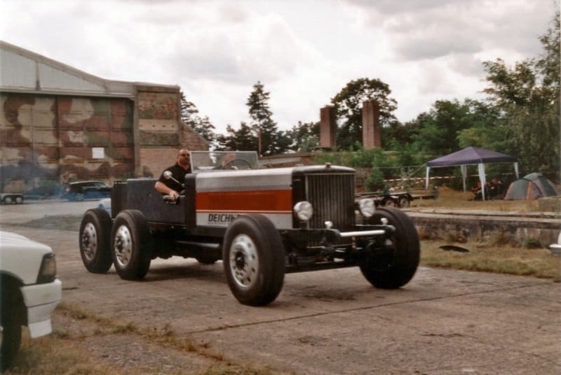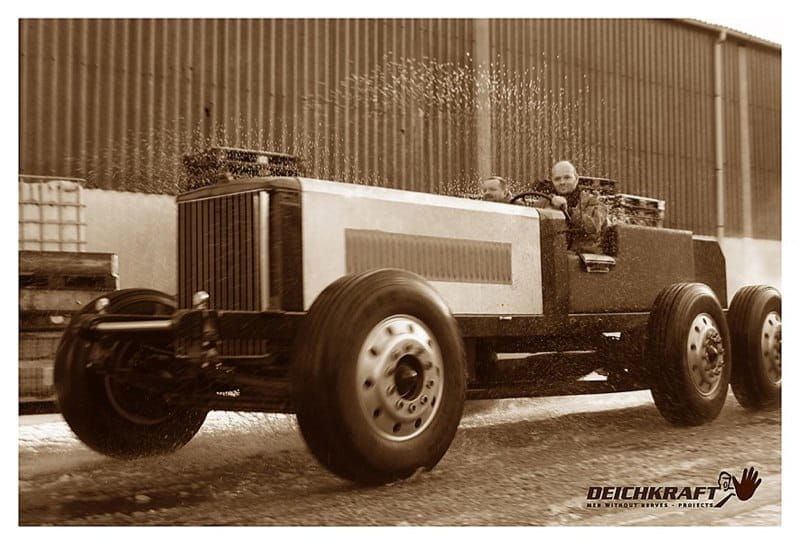 Con un habitáculo biplaza, pero más de dos metros de ancho y una longitud superior a seis metros, es un roadster de lo más imponente. Los vídeos donde se nos muestra en todo su esplendor son impresionantes. Pero lo más impresionante es que alguien se haya atrevido a construir algo así, que ha supuesto ser repudiados por gran parte de los hot-rodders alemanes, muy centrados en coches como el Ford Model A u otros clásicos americanos de los años 30. Desde Diariomotor, ¡bravo por Deichkraft!