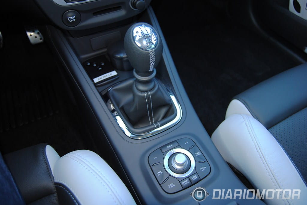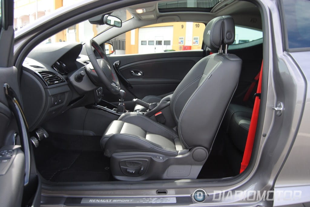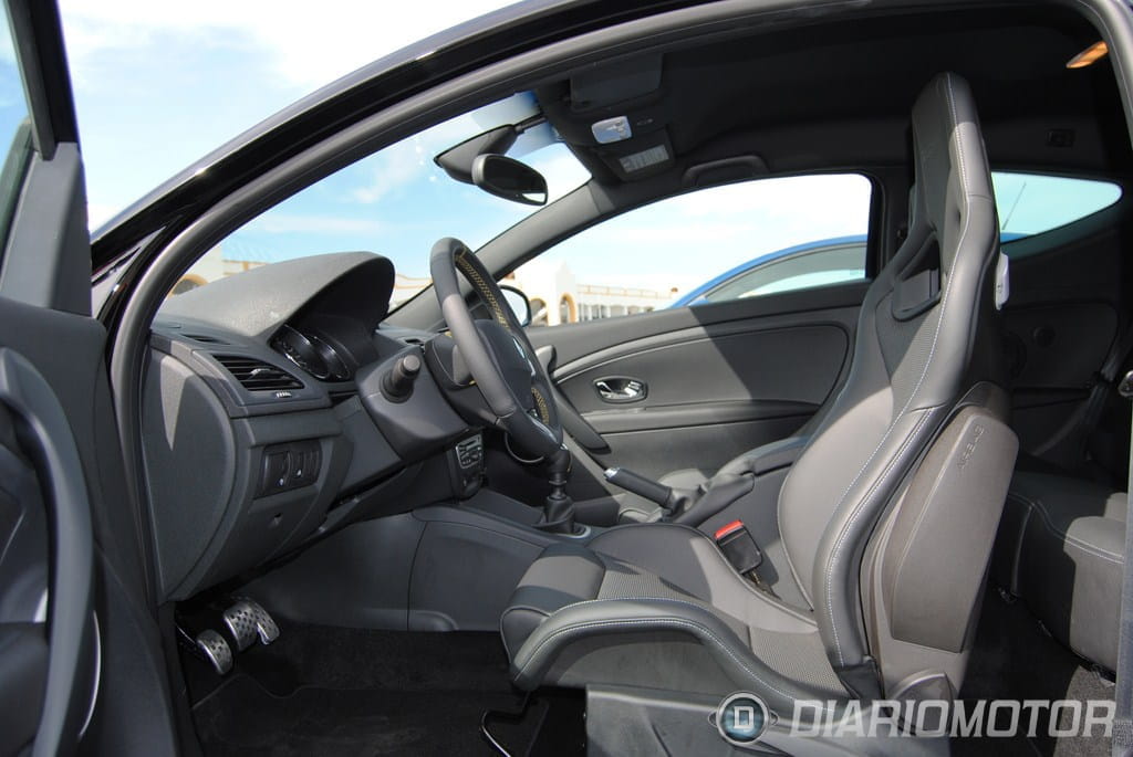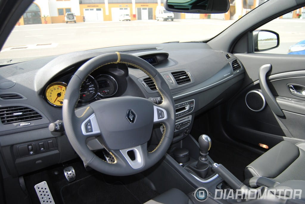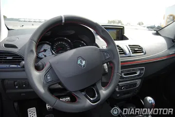 Lo primero que llama nuestra atención es el backet Recaro. Negro, con costuras amarillas, tiene un aspecto inmejorable, también un excelente agarre. El freno de mano electrónico de los Mégane que hemos probado estos días se torna ahora en uno convencional, el volante en cuero con zonas perforadas también recibe costuras amarillas, al igual que la palanca del cambio, los pedales ahora son de aluminio, los guarnecidos de las puertas y reposabrazos se revisten de un acolchado con una decoración símil a carbono.