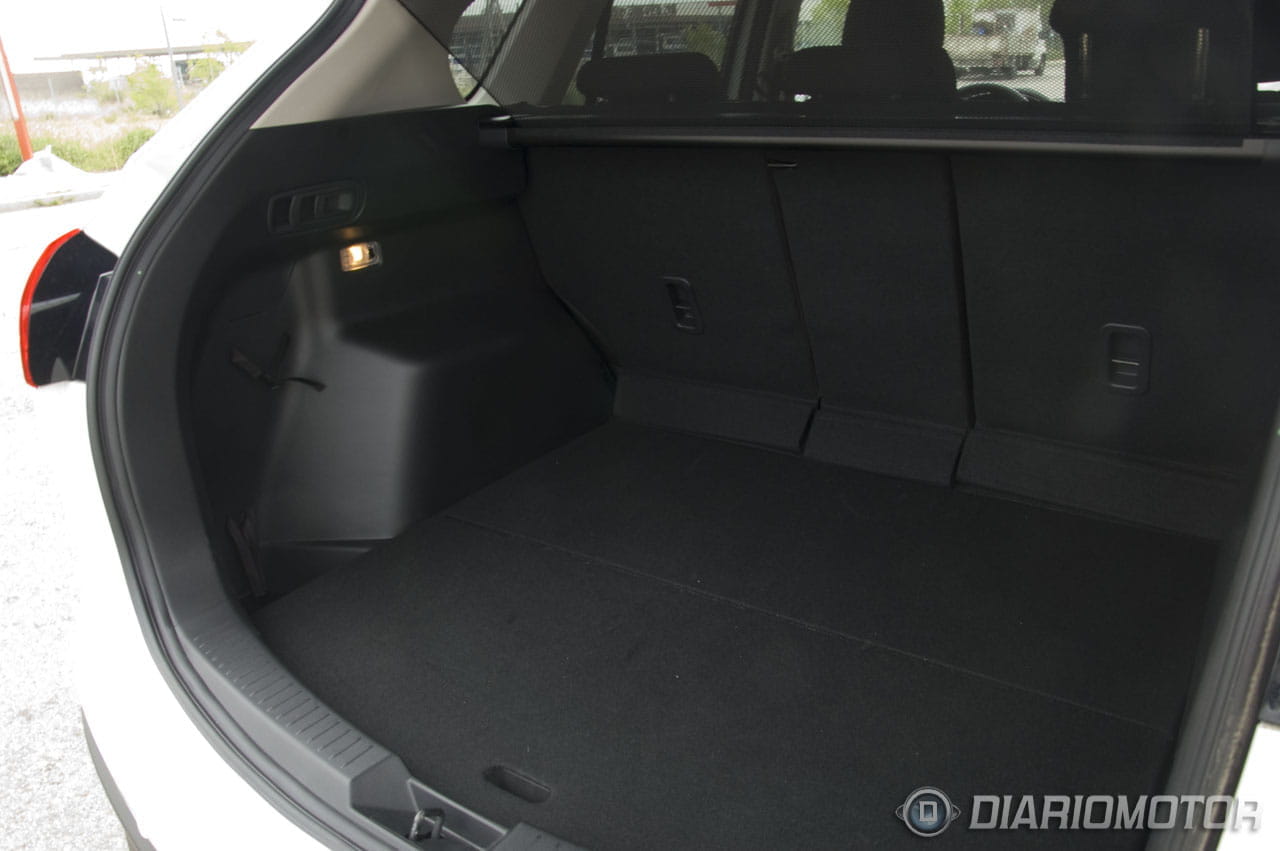 Otro detalle interesante es la bandeja de lona integrada que separa el habitáculo del espacio de carga y que se pliega y despliega solidaria al portón trasero. En el Mazda CX-5 se ha prescindido de rueda de repuesto de emergencia, sustituyéndolo por un kit de reparación de pinchazos oculto en un doble fondo bajo el suelo del maletero. Este doble fondo además cuenta con unos receptáculos para objetos de poco tamaño, por ejemplo, el juego de triángulos, algunas herramientas, un paraguas… Opcionalmente Mazda ofrece la posibilidad de instalar en este doble fondo una rueda de repuesto de “galleta”.