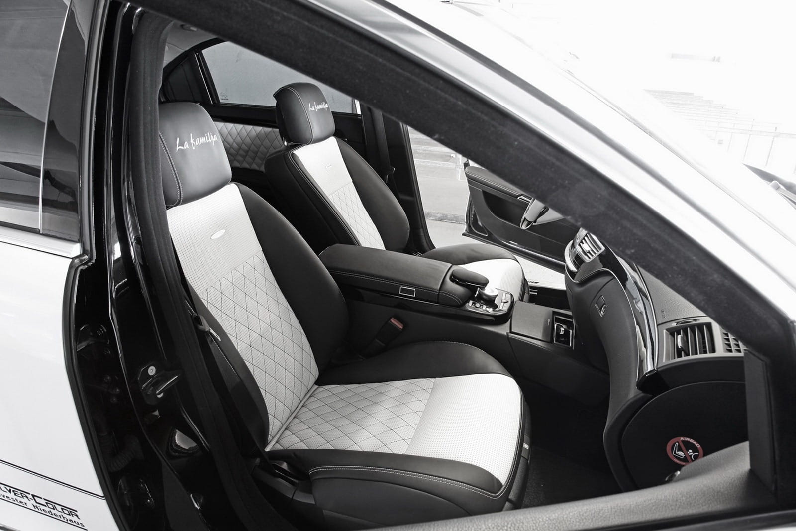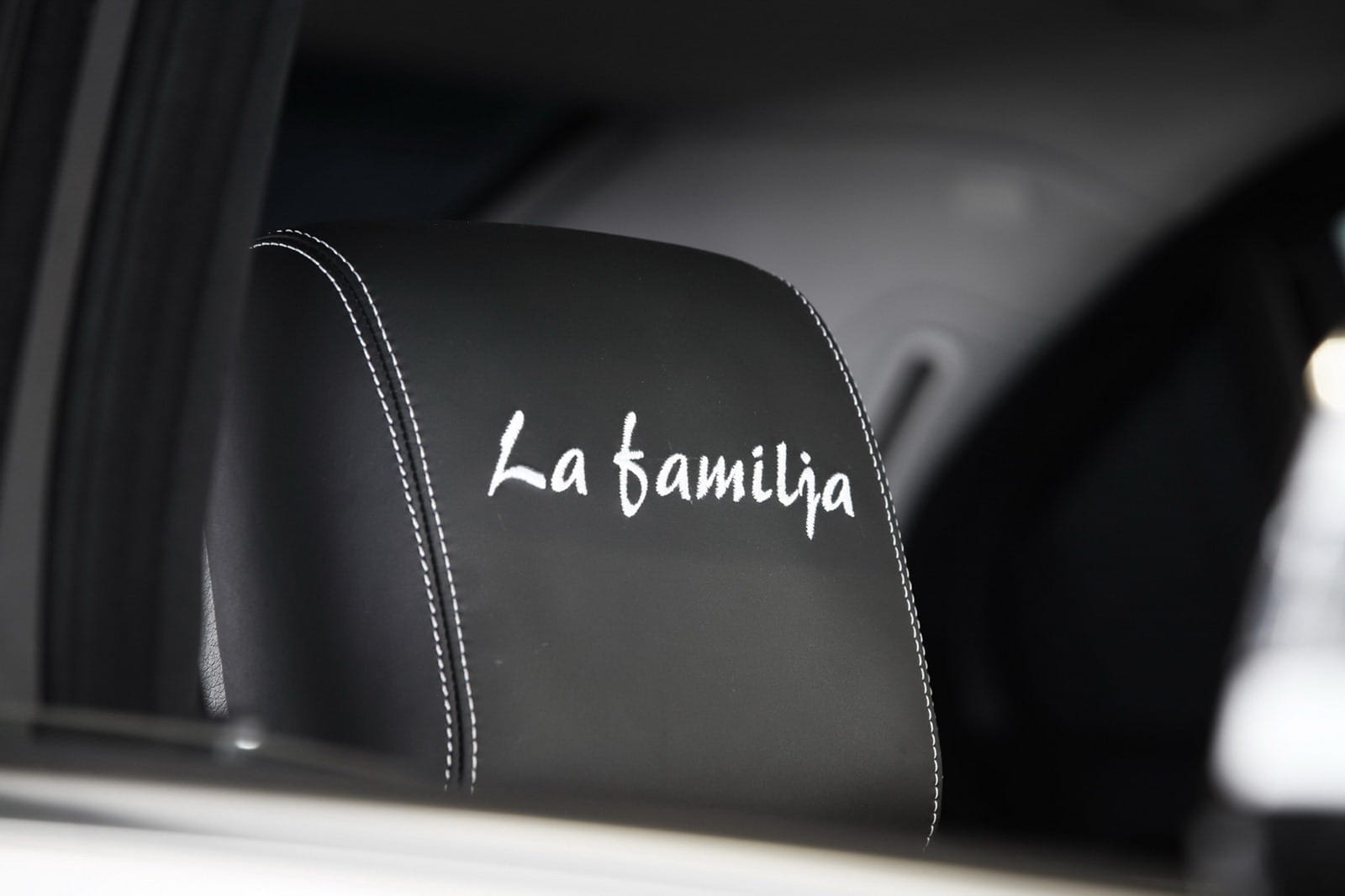 El exterior se completa con un vinilo bicolor que alcanza al capó, techo y portón del maletero. En el habitáculo el buen gusto sigue sin estar demasiado presente, la combinación de cuero blanco con negro no es de lo más adecuada. Los reposacabezas tienen bordados la palabra “La familia”, cosa que no entiendo y realmente me parece de mal gusto. En cualquier caso, el preparador lo presenta con muy buenas fotografías en alta resolución, que adjuntamos a continuación.