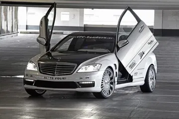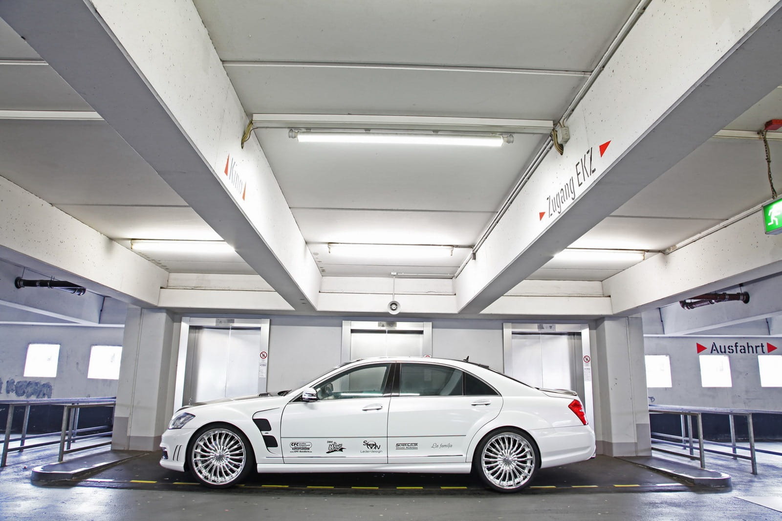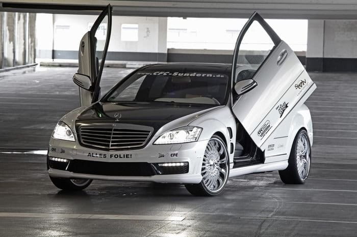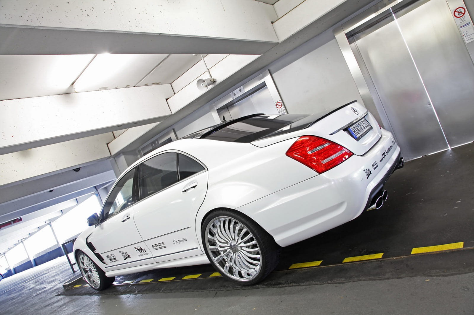 En primer lugar el preparador añade puertas delanteras tipo Lamborghini. ¿Es necesario en una berlina de representación? En segundo lugar, se montan al Mercedes llantas de 22 pulgadas, con un aspecto que ciertamente recuerda al bling-bling americano. Otras modificaciones de importancia consisten en adaptar los paneles de carrocería, paragolpes y ópticas del Mercedes Clase S con lavado de cara a los modelos precedentes, en un intento de actualizarlos al menos estéticamente.