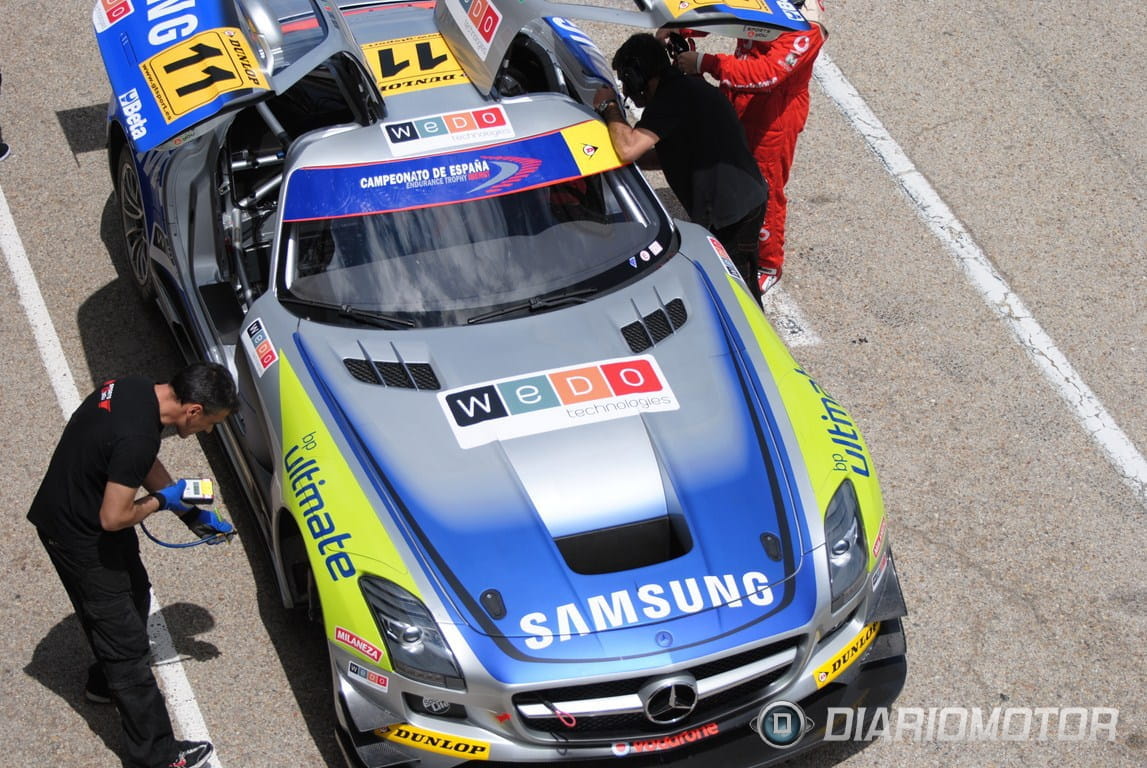 Acaban los entrenamientos libres de los Caterham, ahora sí es el momento de disfrutar del trabajo en boxes, de ver los preparativos y las máquinas a medio montar. Hoy no hay repostajes a toda velocidad ni la tensión de la carrera, pero para todos los que nos gustan los coches, ver el V8 de 6.3 litros del Mercedes SLS al desnudo, empuñar la cámara entre ruedas sin montar, mecánicos dando los últimos retoques de cara a mañana… es simplemente una delicia.