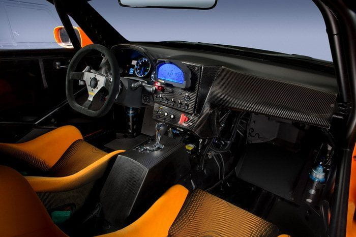 El salpicadero ha sido otro de los elementos que se ha sumado a la fibra de carbono. Se le ha añadido también la imprescincible intrumentación auxiliar para la competición, así como un volante achatado en su parte inferior, asientos ultraligeros de tipo bucket con cinturón de seis puntos y jaula de seguridad. Si comentábamos que sus 422 CV y su motor V8 no sufrían cambios, tampoco lo hace su transmisión, con un cambio automático de 8 relaciones con levas tras el volante y diferencial de deslizamiento limitado en el eje trasero.