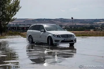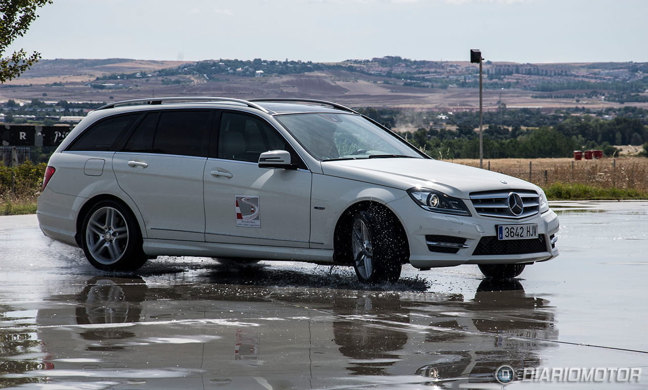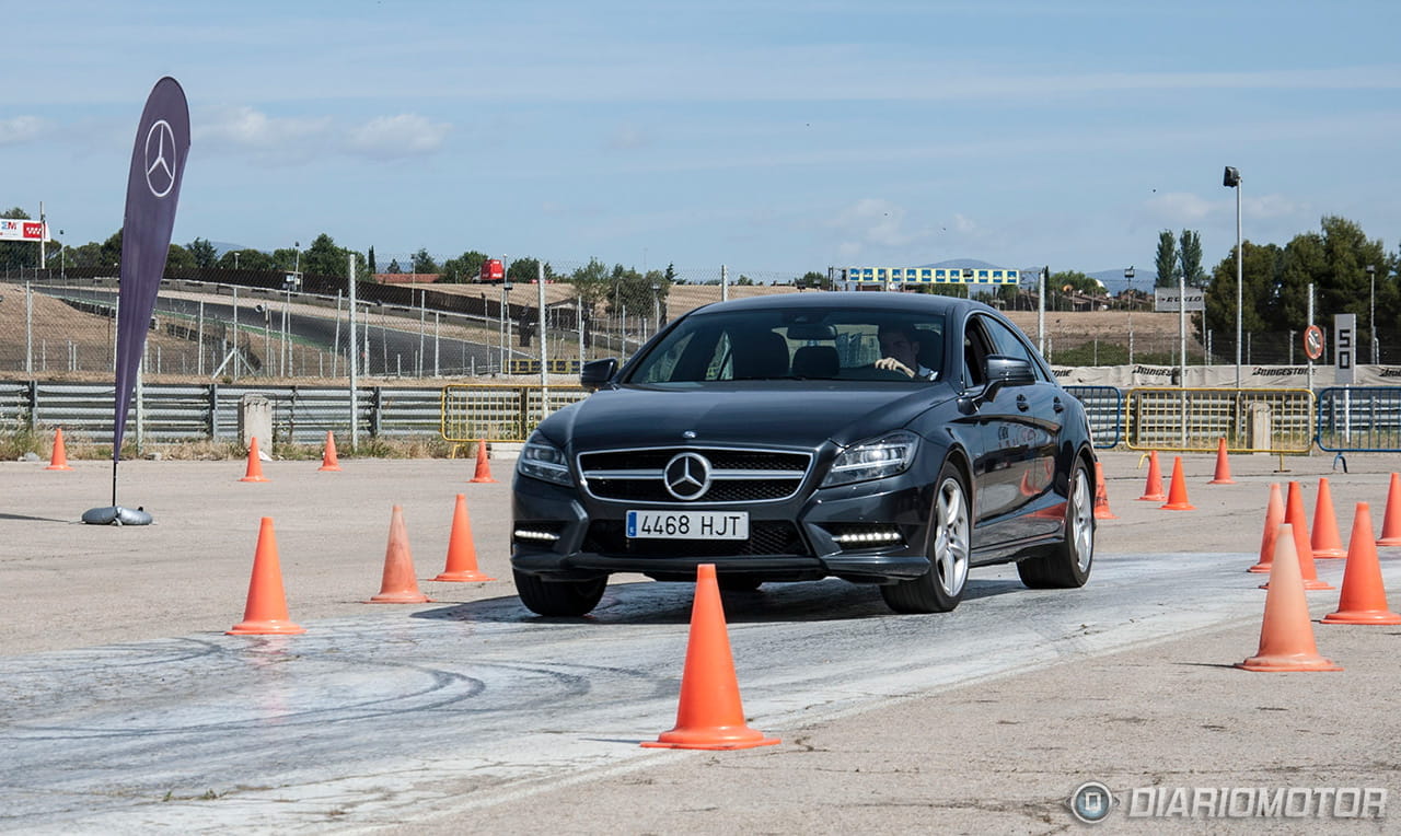 La jornada la iniciábamos con un briefing técnico y una serie de prácticas para poner a prueba nuestras habilidades. Una frenada técnica con esquiva en una pista deslizante primero, para más tarde tratar de hacernos con el control de un Mercedes Clase C Estate con más de 200 CV sin control de estabilidad y en una pista de cemento pulimentado y cubierto de agua con el agarre similar al de asfalto cubierto de nieve y hielo. Otra prueba ineludible pasaba por el típico trazado ratonero, o Mickey Mouse, y qué mejor que un Mercedes CLS para sortear conos y agilizar el movimiento de manos.