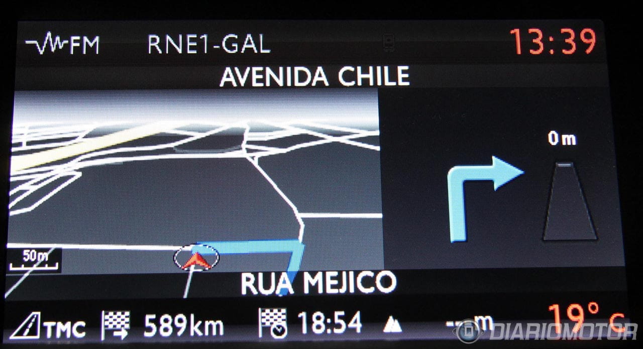 En todas las versiones se puede montar dos navegadores: My Way (el de la unidad probad) o Navidrive (más avanzado y con algún detalle como representación en 3D). Resulta llamativo que al montar el navegador básico perdemos la entrada USB que trae de serie, quedándonos únicamente con una entrada RCA en la guantera, de difícil acceso.