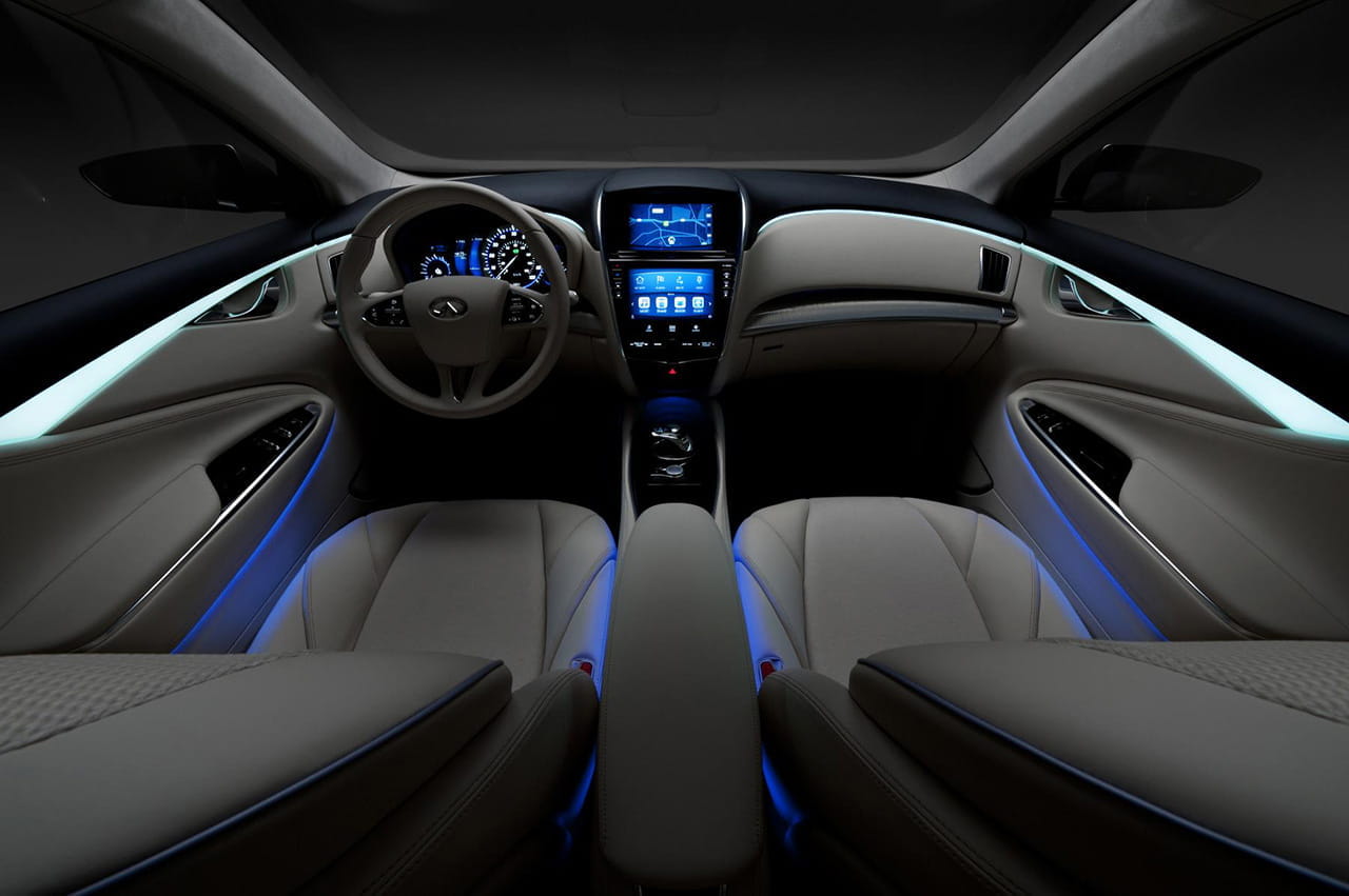 El habitáculo combina la elegancia y la apariencia premium con detalles muy tecnológicos como la iluminación LED o un avanzado cuadro de mandos o una consola central dominada por dos grandes pantallas que se reparten las funciones de mostrar en pantalla información como la cartografía y las indicaciones del navegador, y un menu táctil con iconos para desplazarse por las funciones habituales del equipo multimedia o el climatizador. Parece que Infiniti también apuesta por abandonar los botones de toda la vida en favor de superficies táctiles.