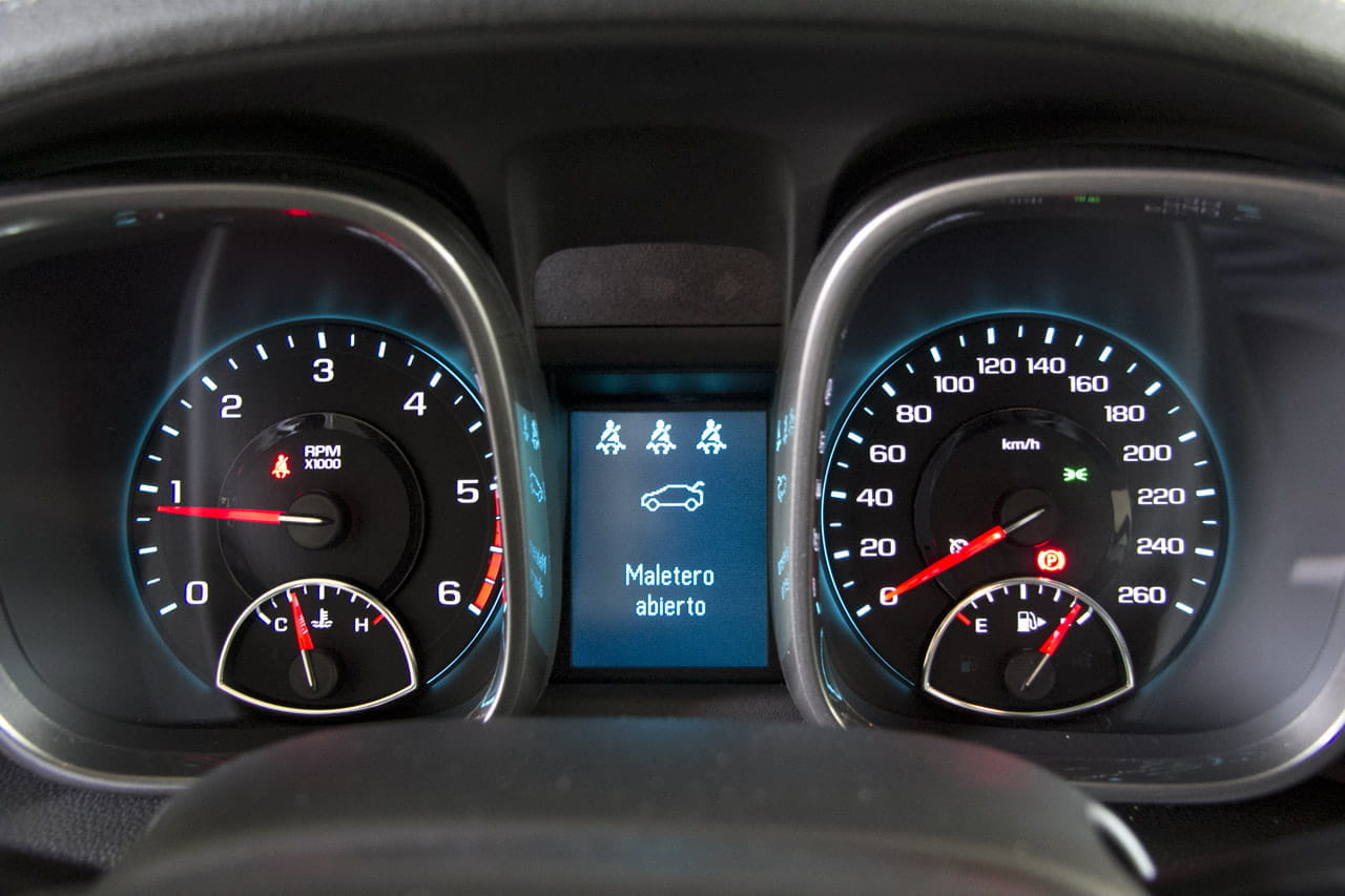 El habitáculo del Malibu es equilibrado en su diseño, no se complica en absoluto y combina el tapizado de cuero completo de los asientos con plásticos blandos, unos pocos no tan blandos y una suave iluminación azul. Estos aspectos con comunes con sus hermanos pero el Malibu tiene detalles del otro lado del charco que son muy característicos, por ejemplo los diales cuadrados que recuerdan irremediablemente a los del Camaro. También es destacable el atrevido diseño del salpicadero justo encima de la guantera o la sencillez del cuadro de mandos.