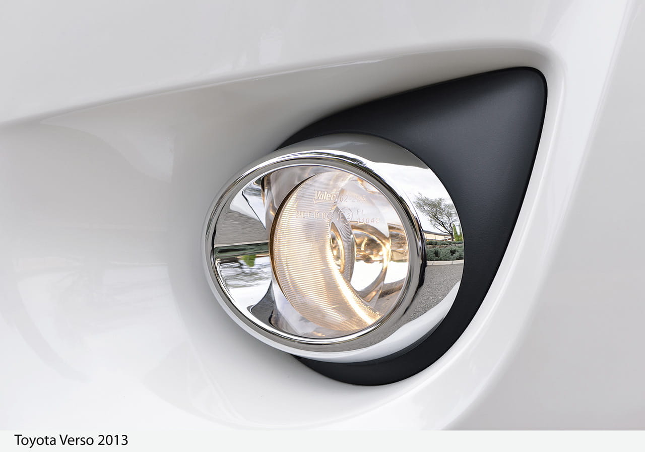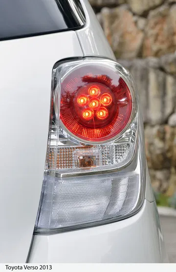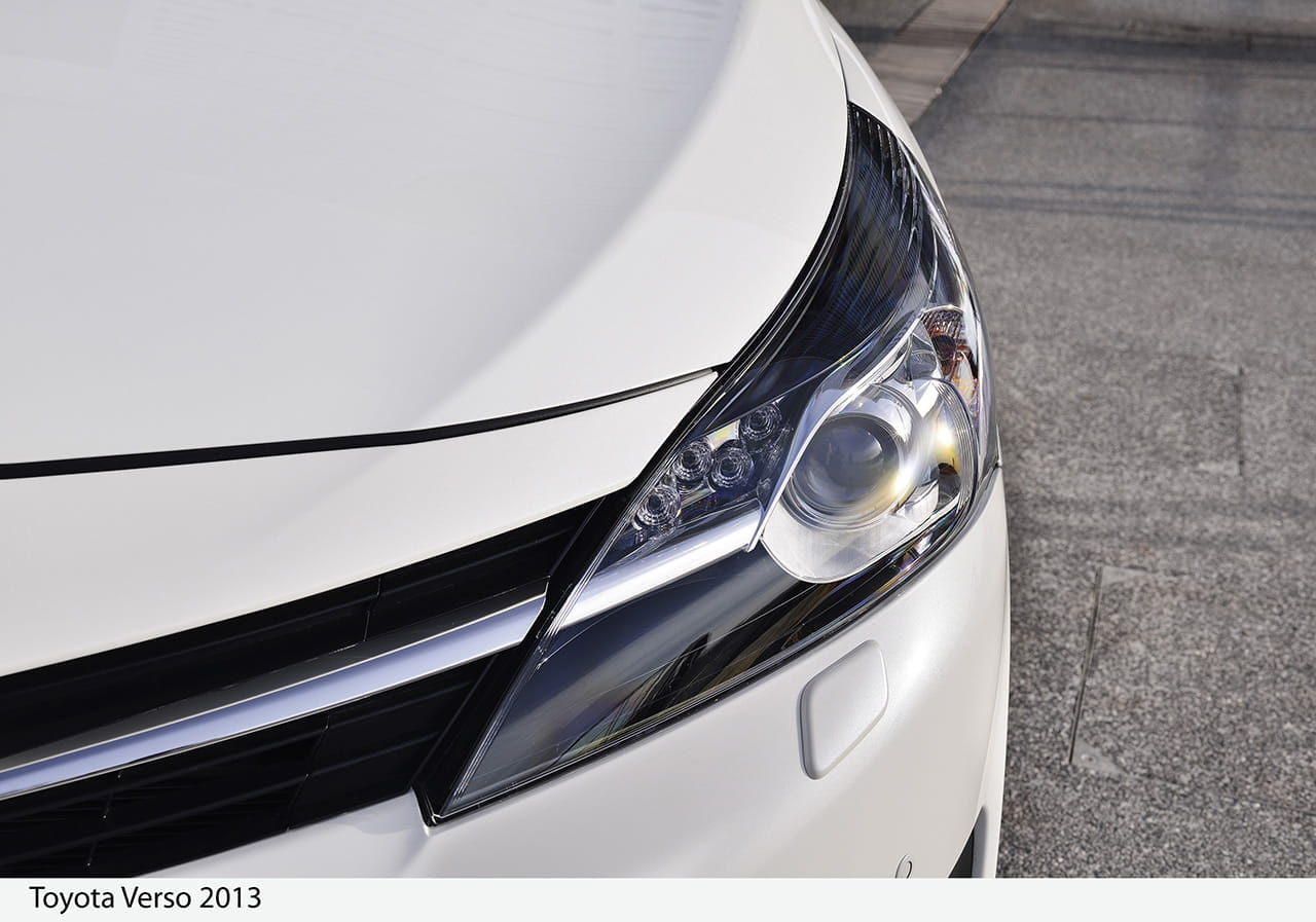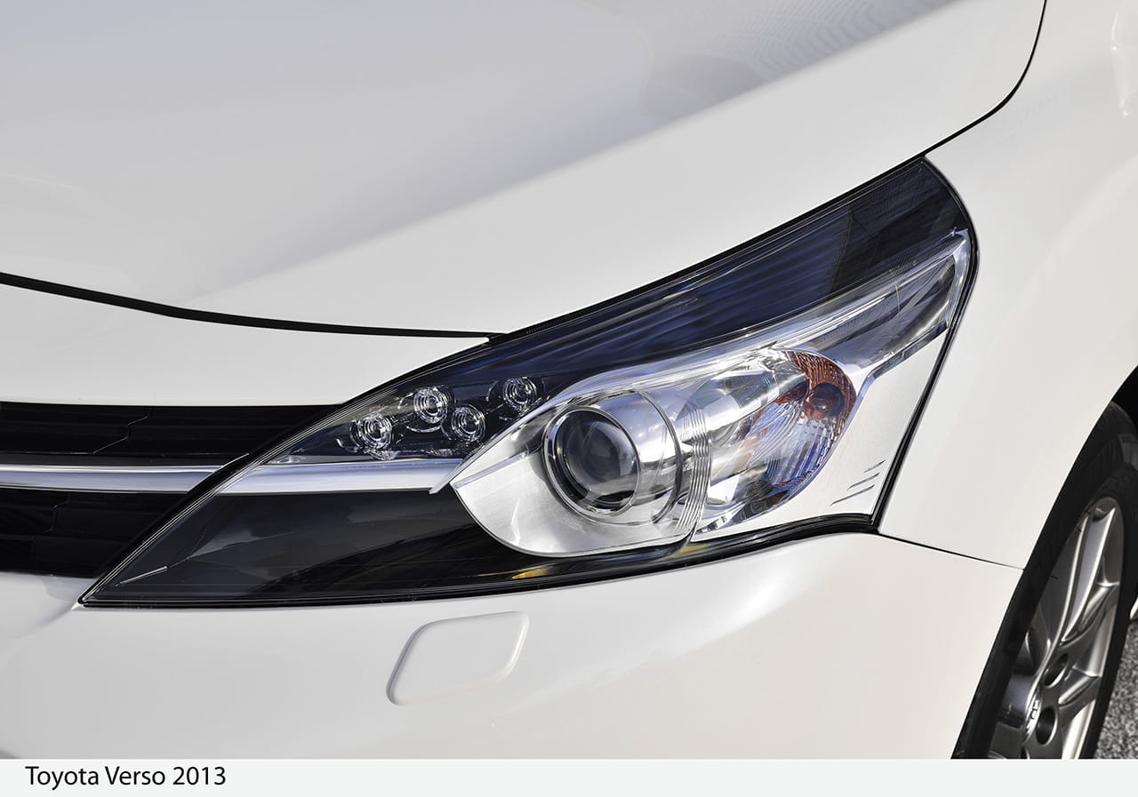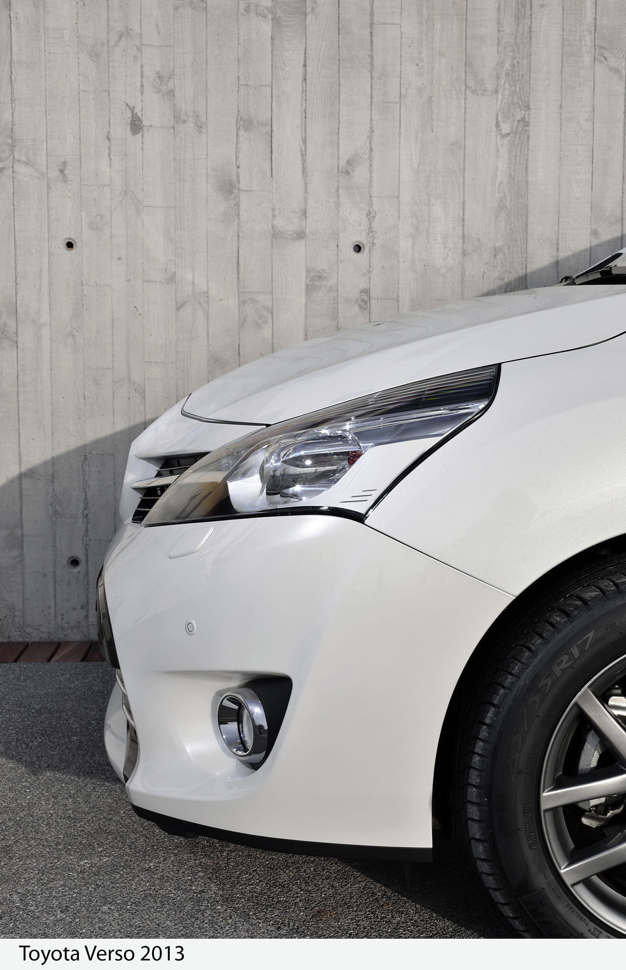 El cambio más importante en el Toyota Verso 2013 salta a la vista, el frontal sigue la línea del nuevo Auris o incluso del propio Toyota Yaris Hybrid. La defensa frontal flanquea una gran parrilla que en palabras de los diseñadores pretende reducir la sensación de altura de un monovolumen compacto de su calado. Lo que si es cierto e indiscutible es que su apariencia – independientemente de las preferencias de cada uno – es más agresiva y moderna, especialmente equipado con las llantas de 17” y acabado oscurecido.