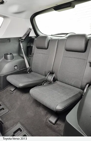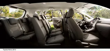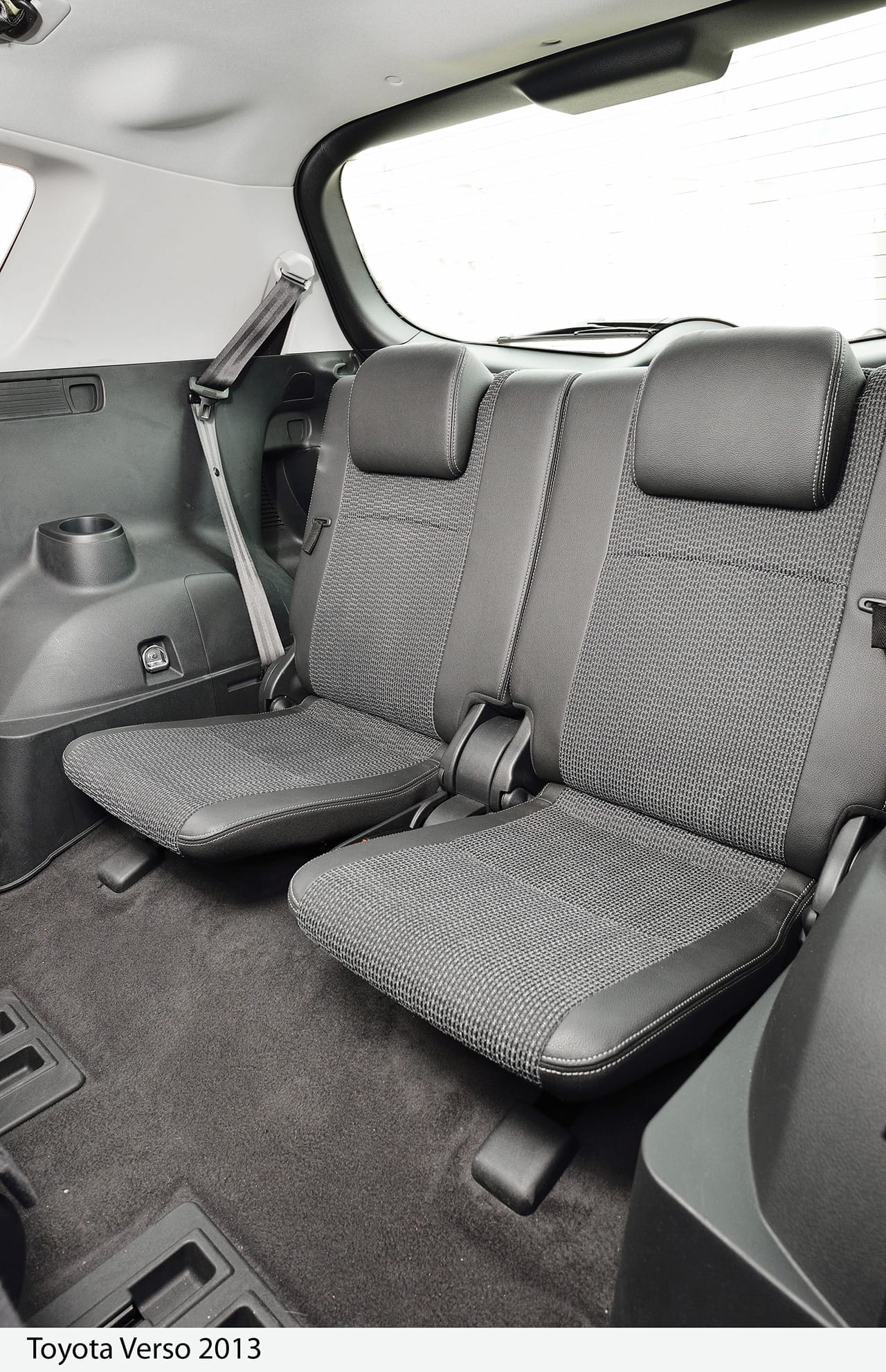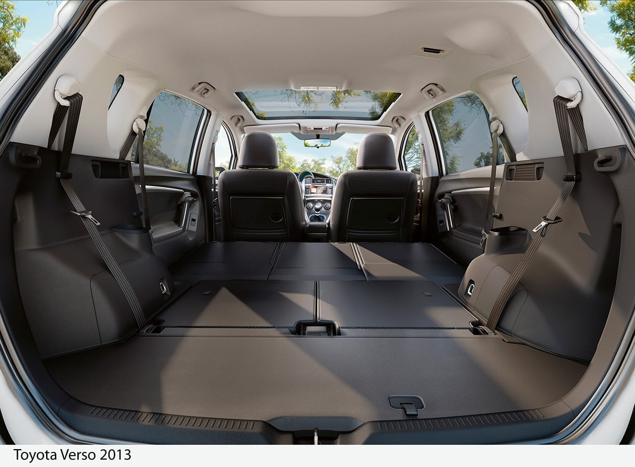 La disposición de los siete asientos del Toyota Verso permite su re-distribución en tres filas, la segunda con asientos deslizantes, para formar hasta 32 combinaciones de asientos diferentes. El espacio de carga con siete plazas es de 155 litros, aumentando hasta 440 litros si prescindimos de la tercera fila de asientos y con un volumen aún mayor si abatimos la segunda fila de asientos, con una longitud de 1.575 milímetros y una anchura de 1.430 milímetros.