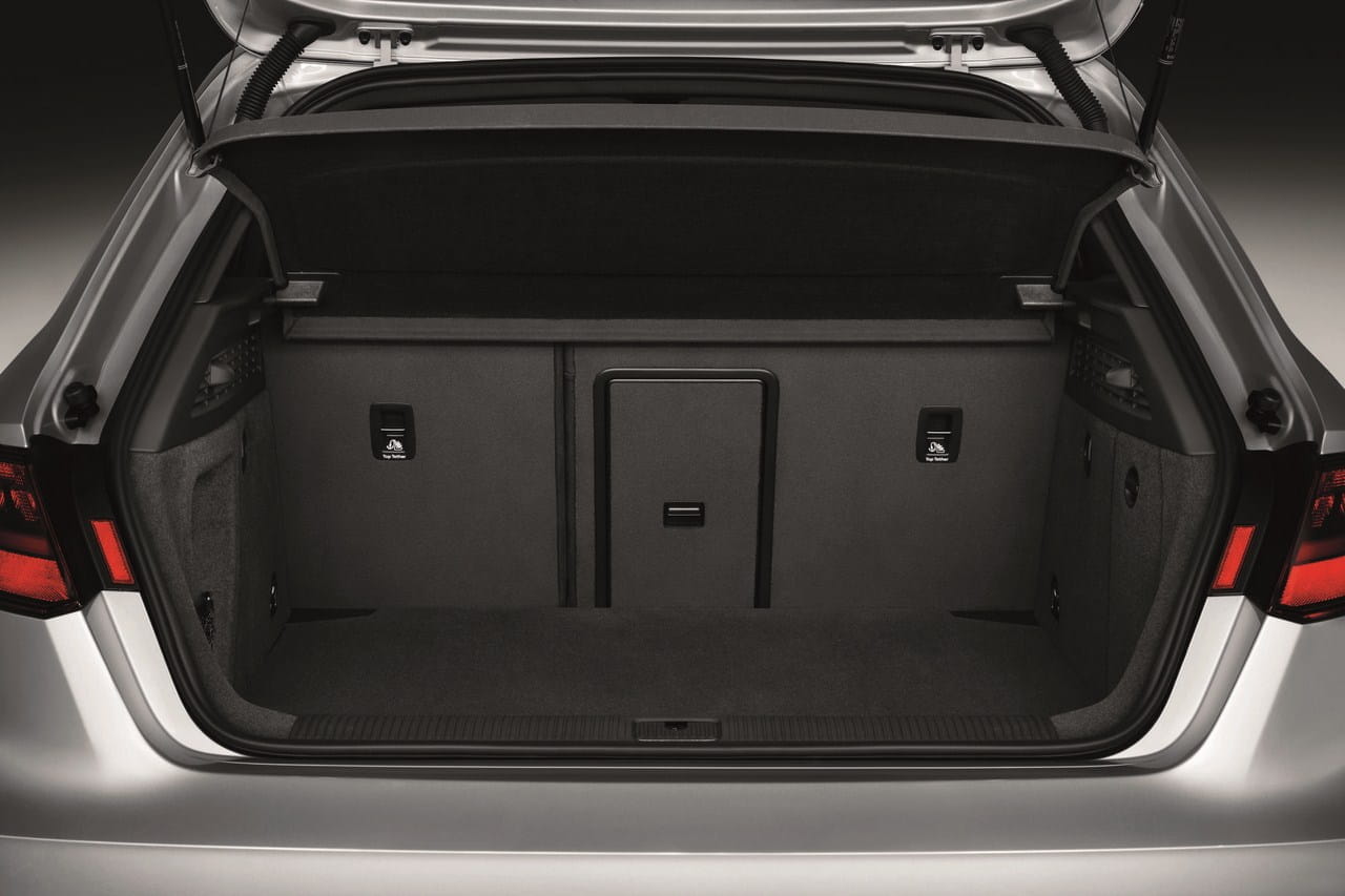 El Audi A3 Sportback cuenta con un maletero de 380 litros frente a los 365 kg del 3 puertas. Si abatimos los asientos, con una relación de 60/40, la capacidad de carga aumenta hasta los 1.220 litros, ofreciendo una superficie de carga plana, ganchos para bolsas y argollas de serie, contando como opción con diversos paquetes para la distribución de los objetos.