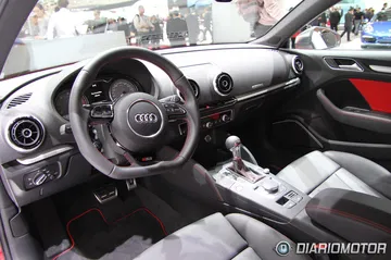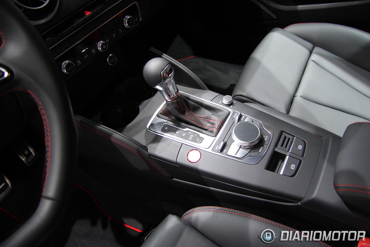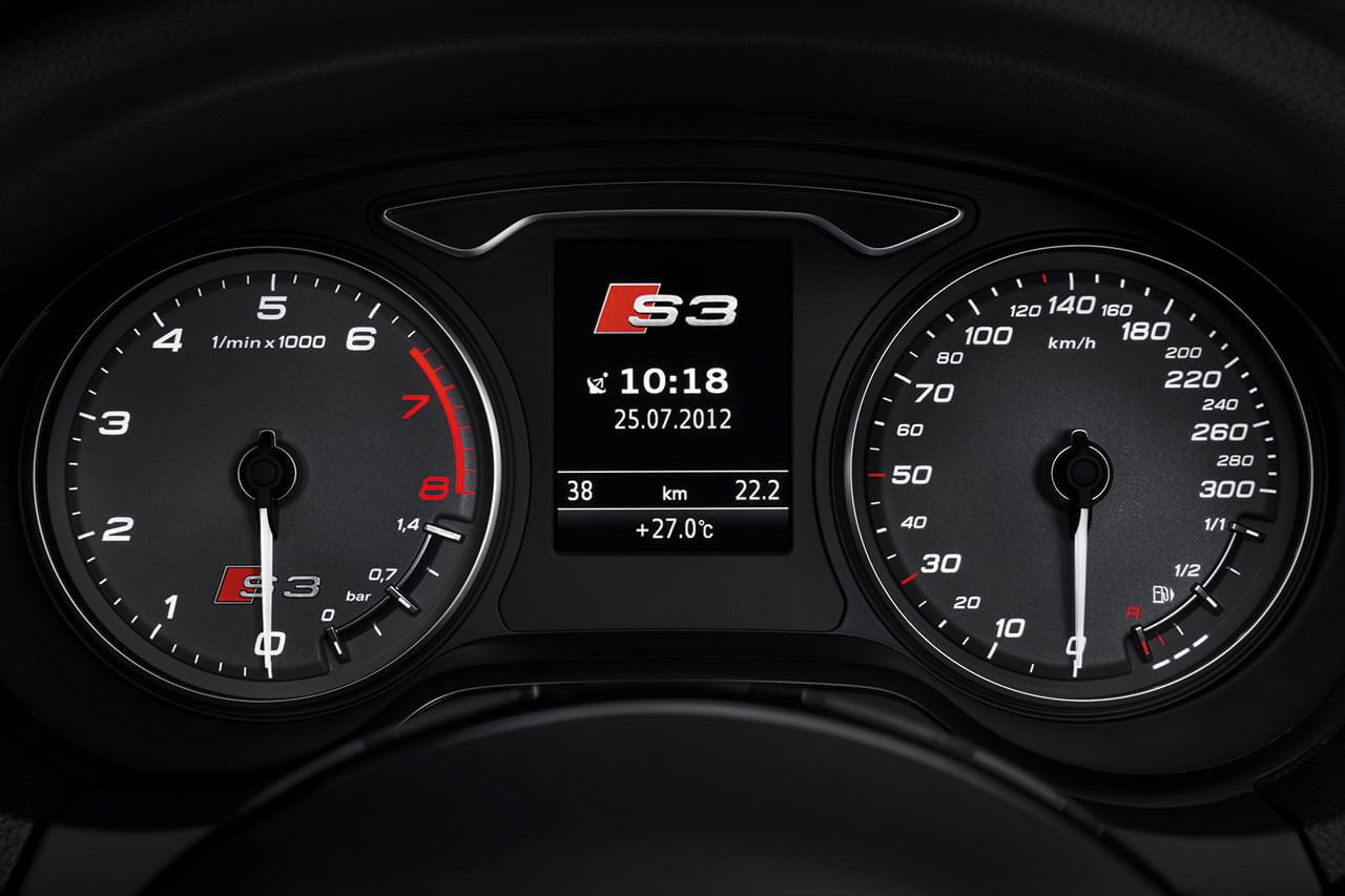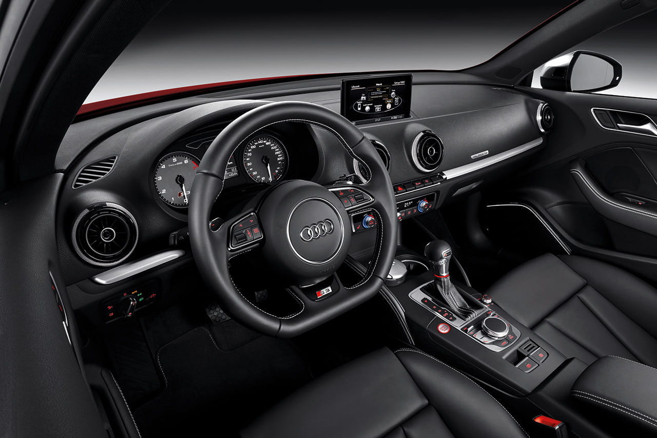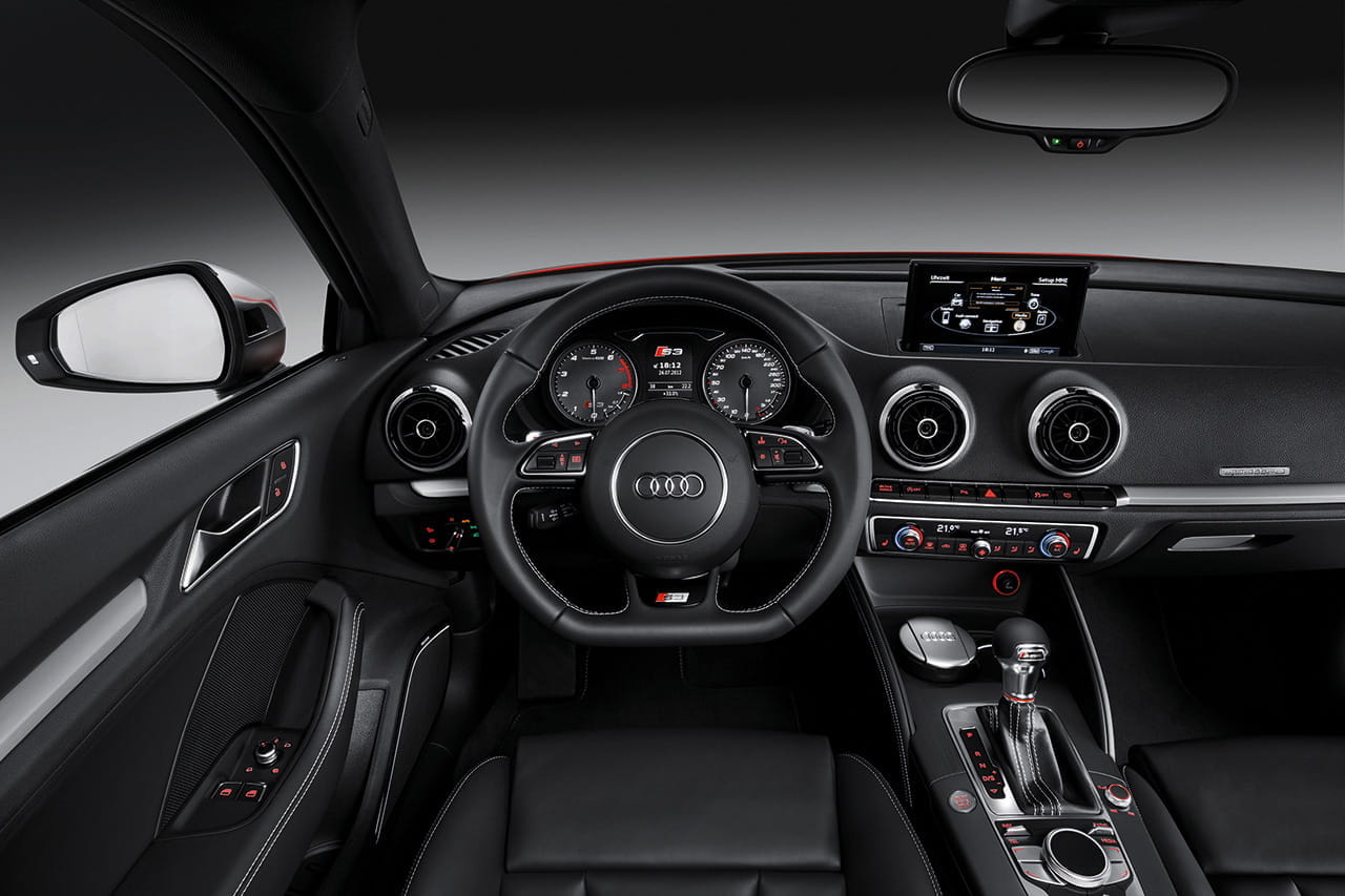 Entre la instrumentación, diseñada y decorada a propósito, se integra también un medidor de la presión del turbo. El sistema MMI con pantalla retráctil que se esconde en el salpicadero, es de serie, y exhibe un fondo de pantalla especial para este S3. El volante de concepción deportiva y achatado por debajo, esta tapizado con cuero y cuenta con levas con tacto de aluminio para los modelos S Tronic.