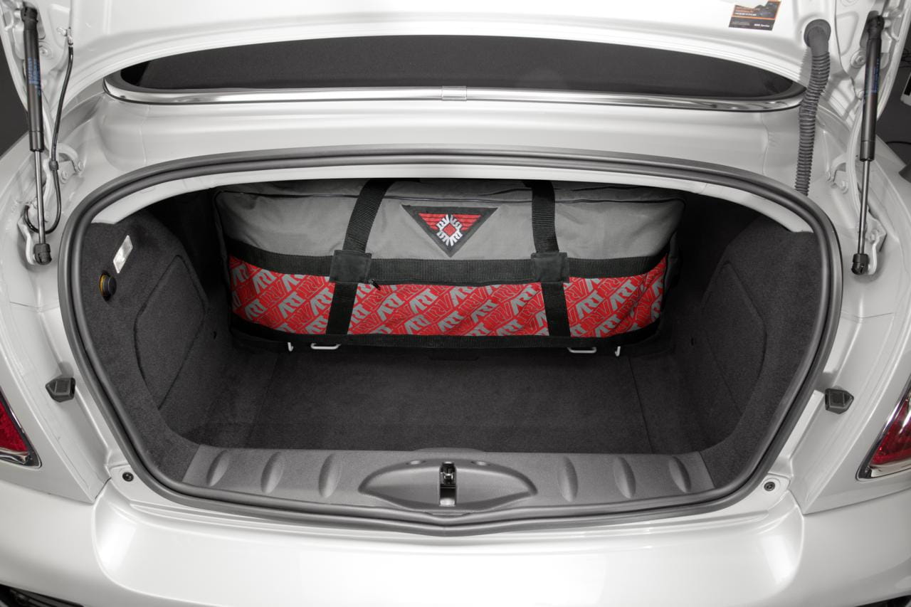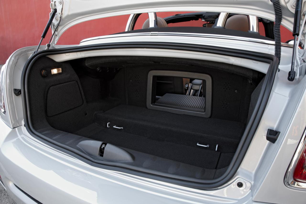 Al renunciar a sus plazas traseras y haberse instalado una barra que refuerza la rigidez del chasis, probablemente este Mini sea el que pueda presumir en esta comparativa de un mayor maletero puesto que el vano existente para alojar carga es de un volumen considerable. Cuenta con una bandeja vertical que separa la carga de los ocupantes. En ese sentido y pese a su concepción deportiva y únicas dos plazas, se podría decir que es el más práctico de los tres.