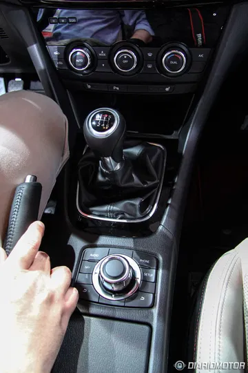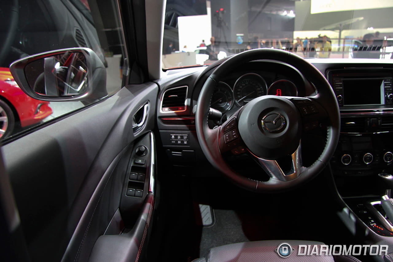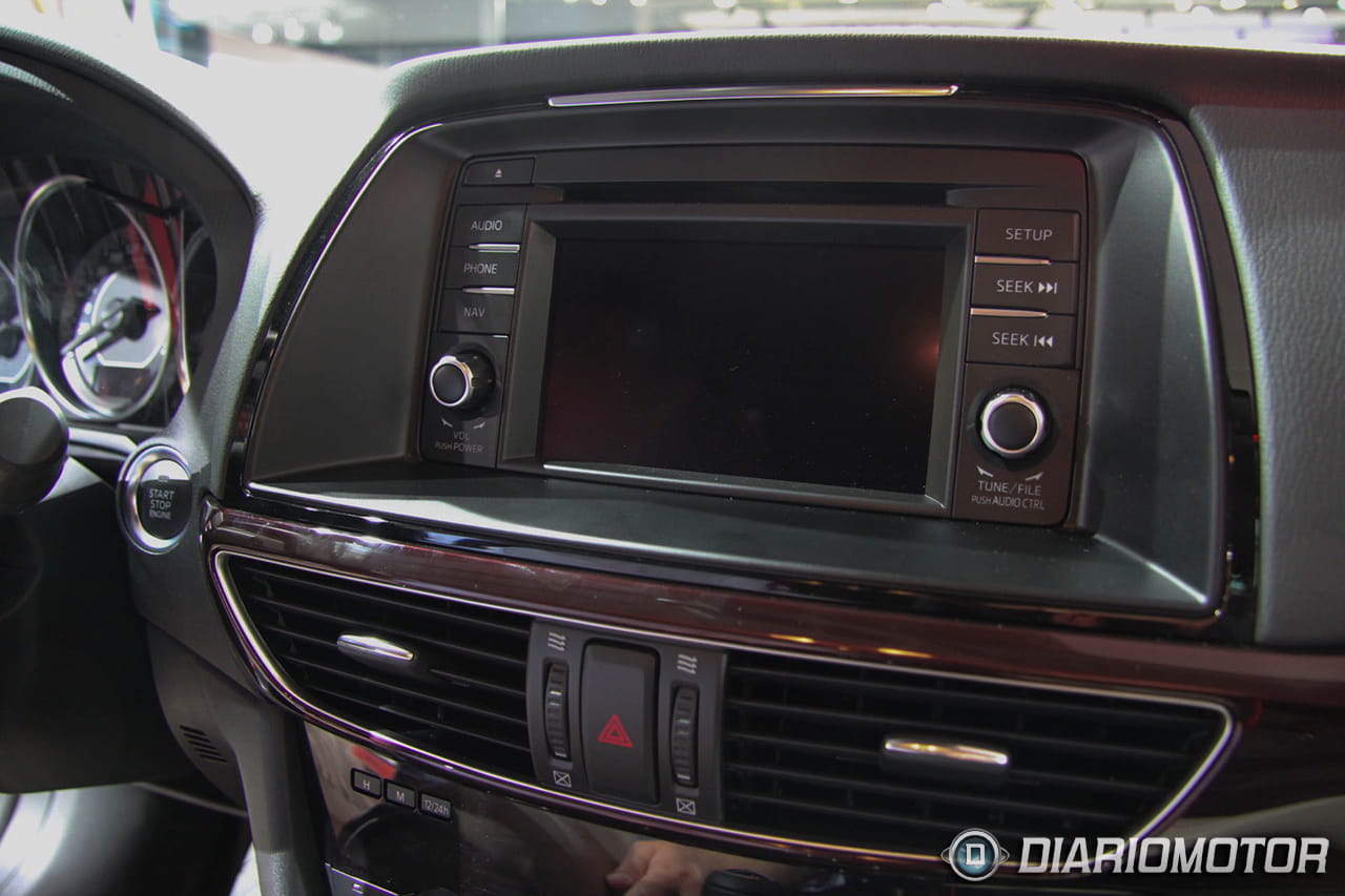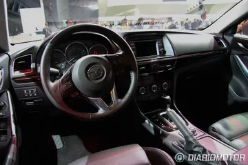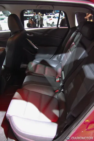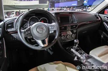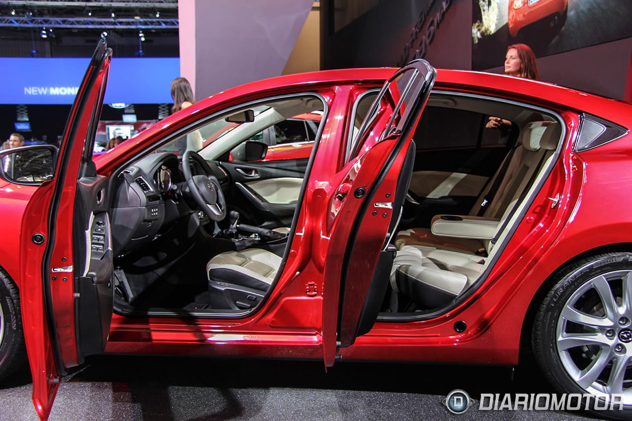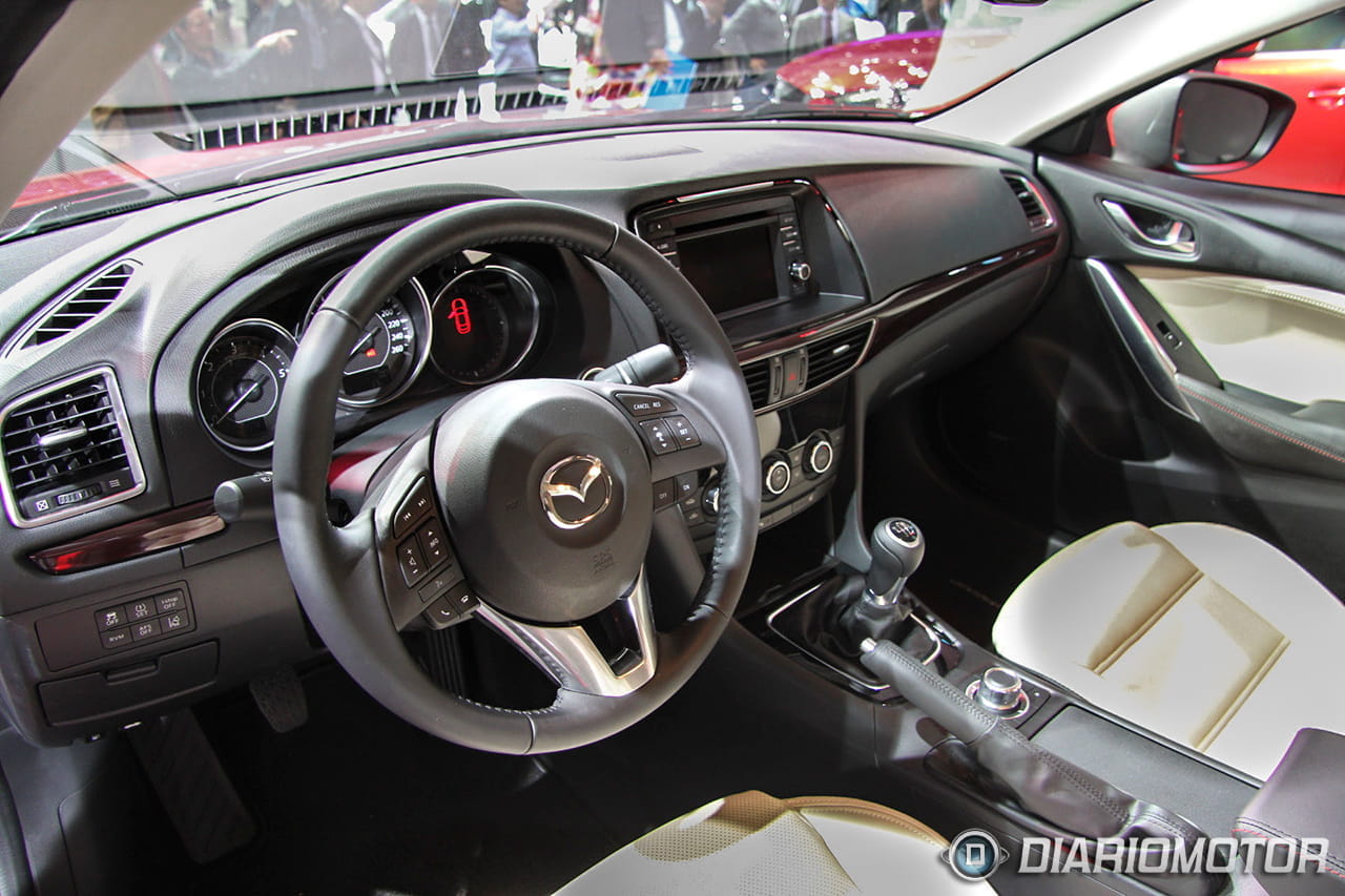 Por fuera en definitiva, no creo que sea el mejor producto para aquellos que aman la intemporalidad de una berlina y los diseños más sobrios y clásicos, por ejemplo los amantes de las berlinas de lujo alemanas; sino todo lo contrario, aquellos que buscan elegancia con un mayor atrevimiento. No obstante el Mazda 6 trata de ganar algo terreno respecto a estos, ha aumentado su tamaño y la calidad que apreciamos en nuestro primer contacto en el Salón de París es muy alta. Plásticos mullidos, inserciones de plástico brillante y detalles agradables entre los que desentona algún plástico duro que aparenta menor calidad como en la guantera.