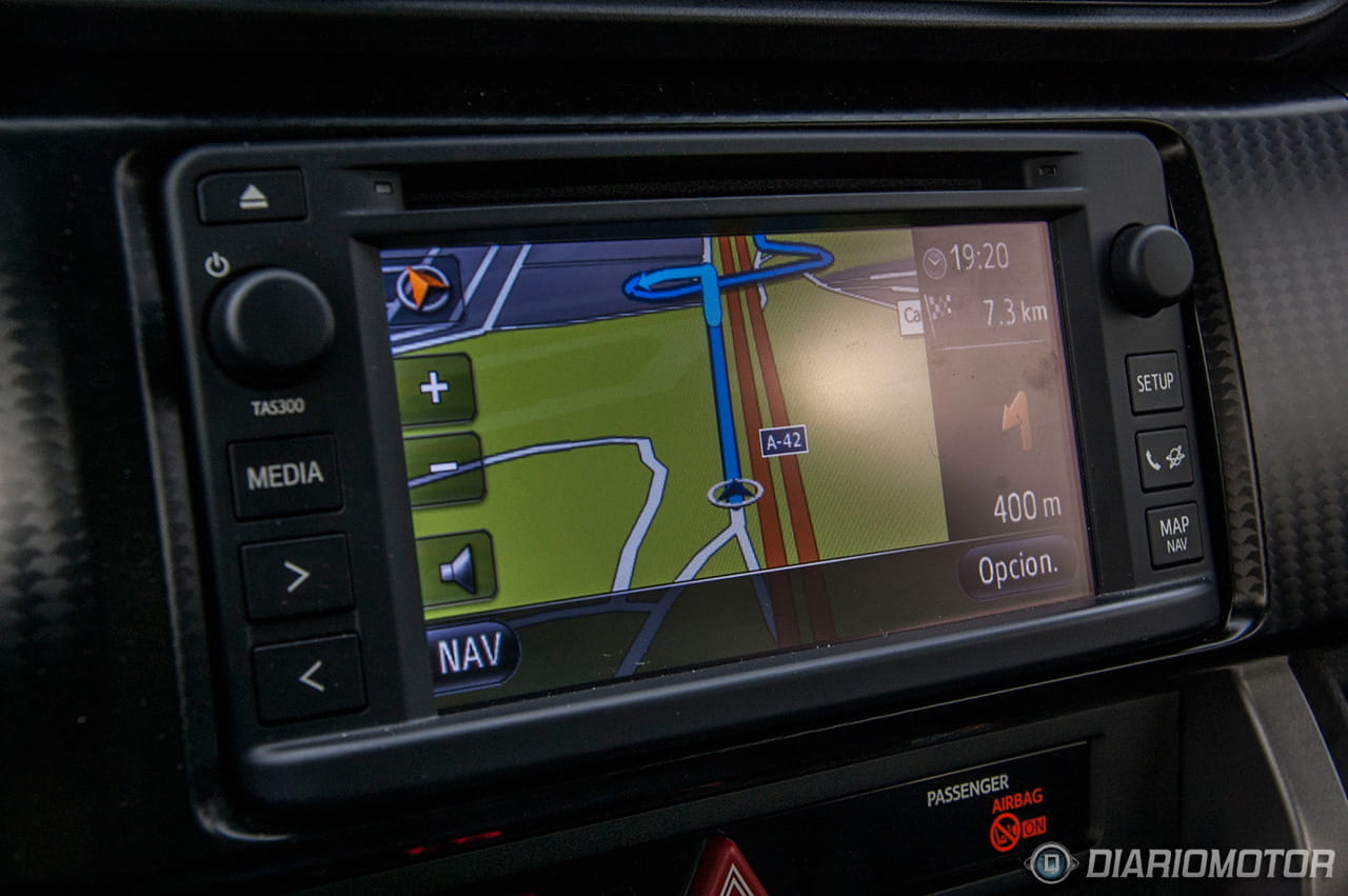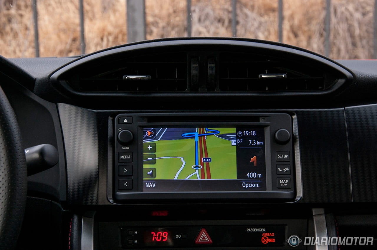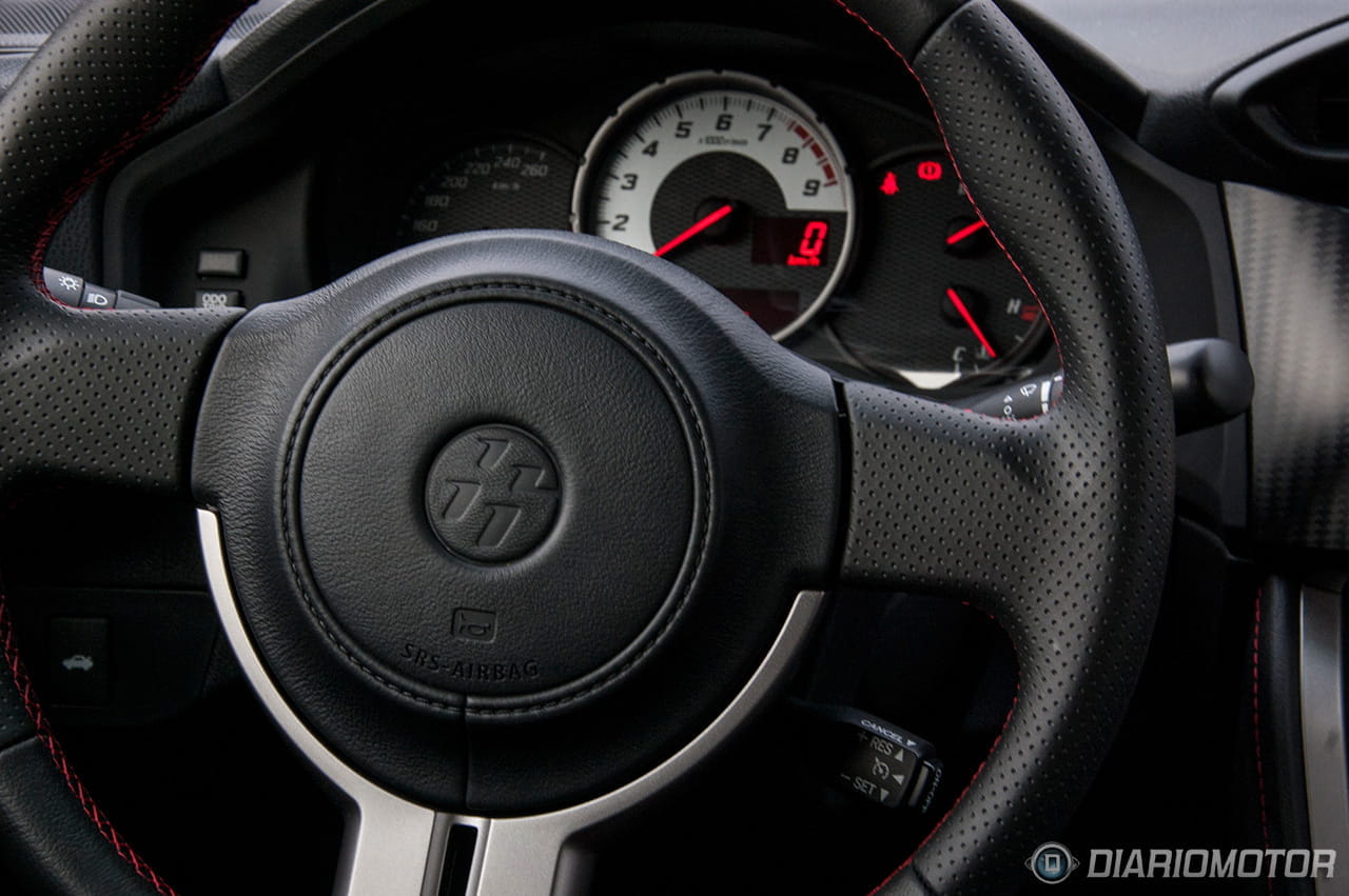 Aún así los ajustes son buenos y está diseñado por y para el conductor. El volante está tapizado de piel con unas costuras en el aro que ayudan a sostenerlo. Los mandos del control de crucero están en palancas tras el aro y no disponemos de controles para el equipo de sonido. Sobre el volante no hay más botones que el clásico central para la bocina, nada que rompa o pueda dificultar nuestra conducción. No olvidemos las prioridades del Toyota GT 86. No obstante el equipo multimedia y de navegación Toyota Touch (GO) es tan accesible que yo tampoco veo necesario romper la estética del volante con botones. Esto ya va en cuestión de gustos, sinceramente.