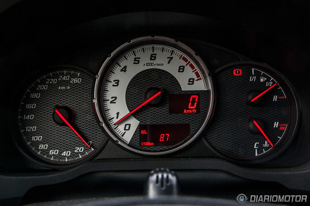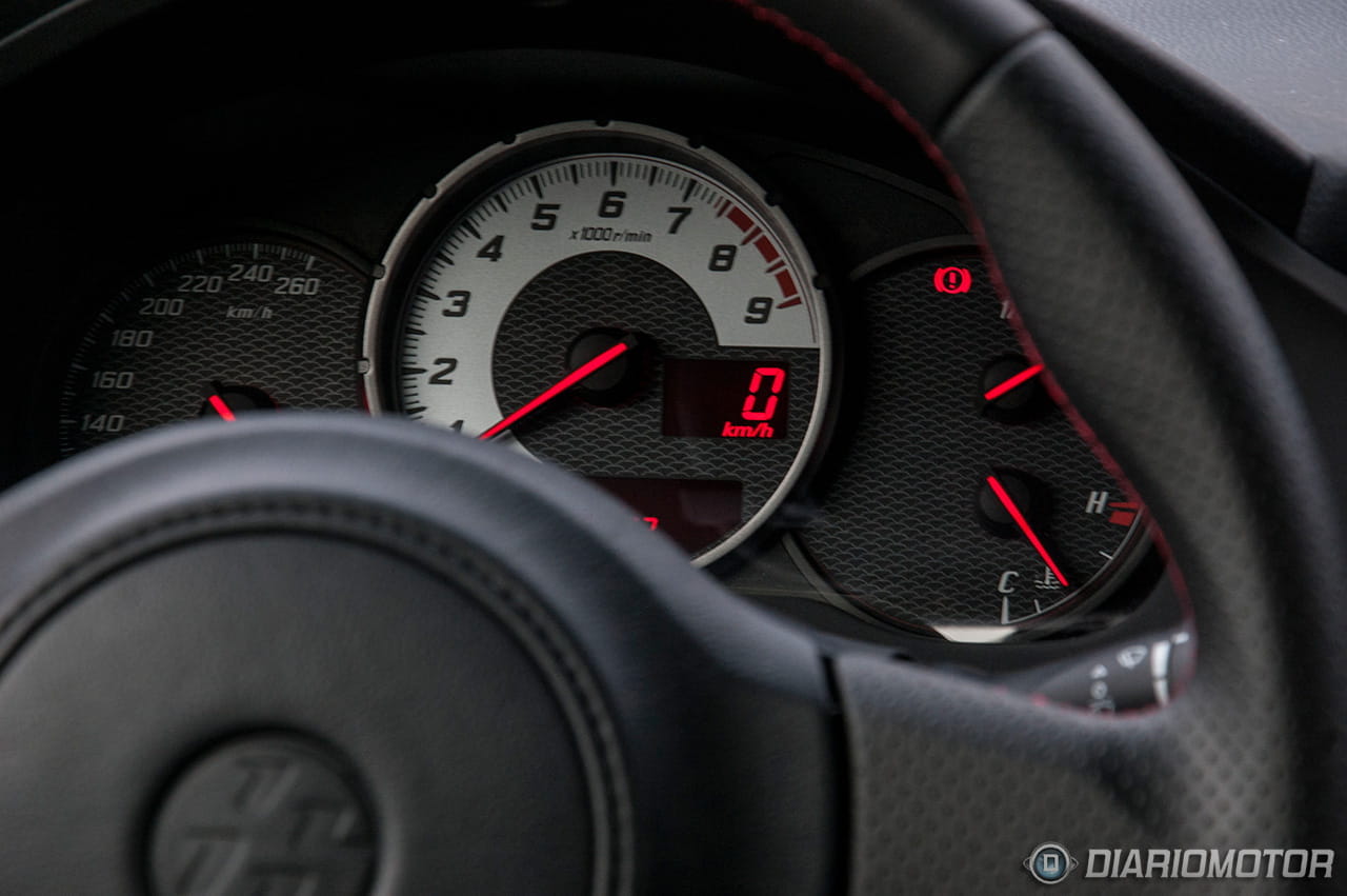 El cuadro de mandos es bastante minimalista y clásico, nada de avanzados ordenadores de a bordo ni pantallas a todo color. Tres circunferencias integran – de izquierda a derecha – el cuentavueltas, el cuentakilómetros y la temperatura del circuito de refrigeración y el volumen del depósito de combustible, o la gasolina de 98 octanos que tenemos disponible para consumir. Un escueto ordenador de a bordo y un cuentakilómetros digital, muy práctico, útil y apropiado para un coupé deportivo como el Toyota GT 86.