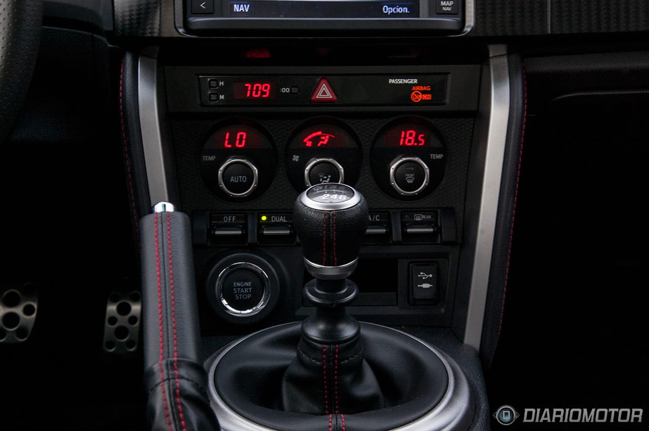 La primera sensación al acomodarme en mi asiento y contemplar el salpicadero fue la misma que sentí en deportivos americanos como el Chevrolet Camaro, el Chevrolet Corvette o el Ford Mustang. El diseño con deportividad contenida, los materiales muy sencillos y nada llamativos, hasta el punto en que nos parece que no es acorde con un coupé de su precio. Anotemos este defecto. No obstante aquí la prioridad era otra, deportividad y sensaciones, quien estuviera buscando un habitáculo confortable, elegante y lujoso se ha equivocado de coupé y el Toyota GT 86 no es lo que busca. Así de sencillo.