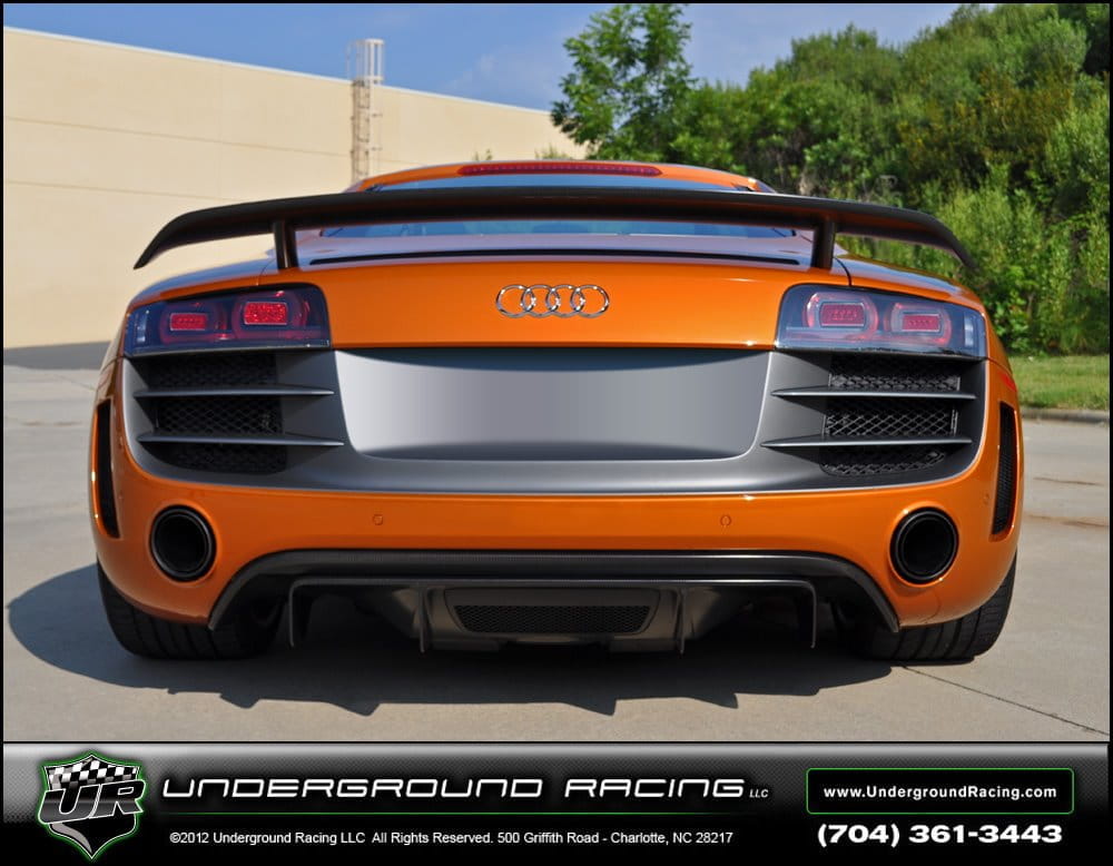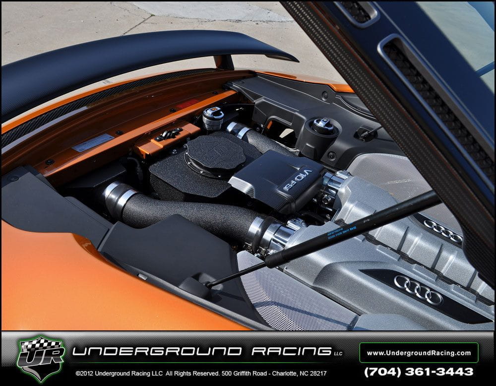 El propietario de esta máquina se decantó por el Stage 3 para el Audi R8, el más radical de los que ofrece Underground Racing. Esto significa que el motor se desmonta por completo, para trabajar en cada una de las piezas reforzándolas o sustiuyéndolas si fuese preciso. Además, cuenta con escape y admisión de nueva factura, doble turboalimentación y gestión electrónica MoTec.
