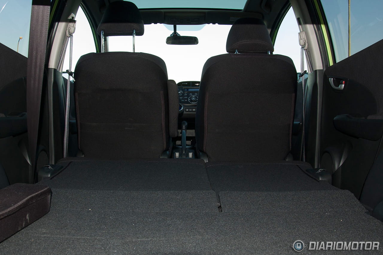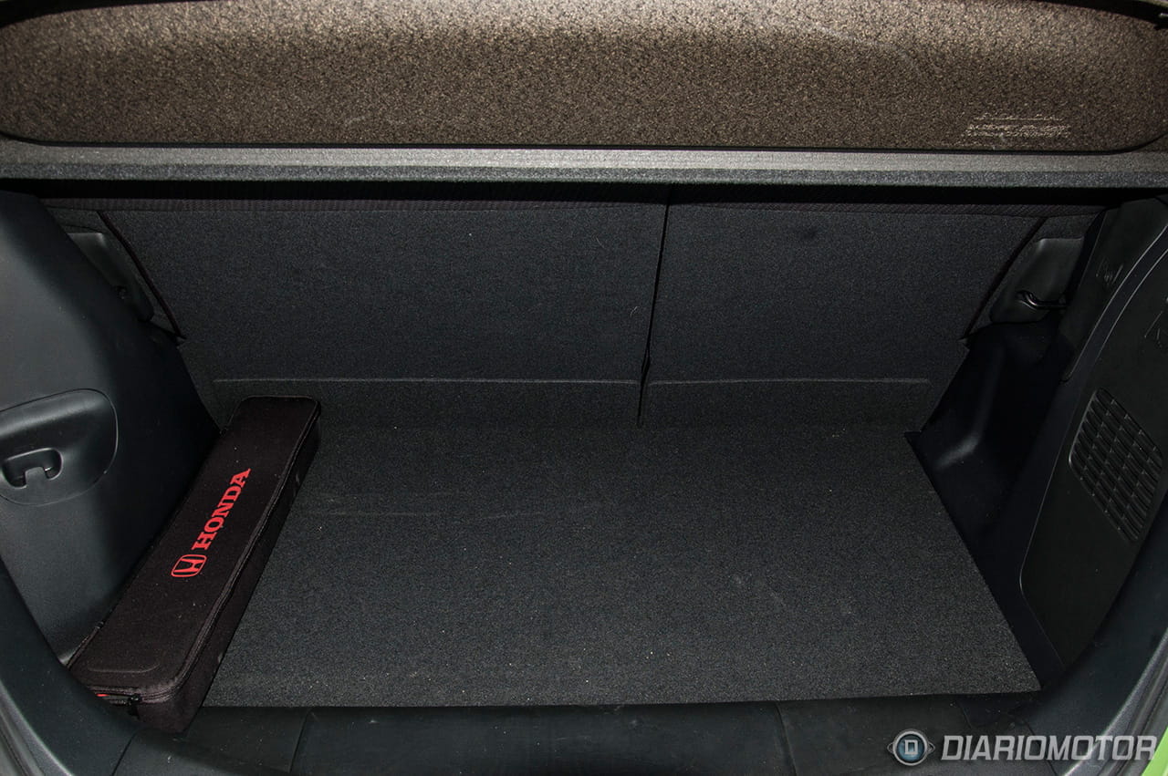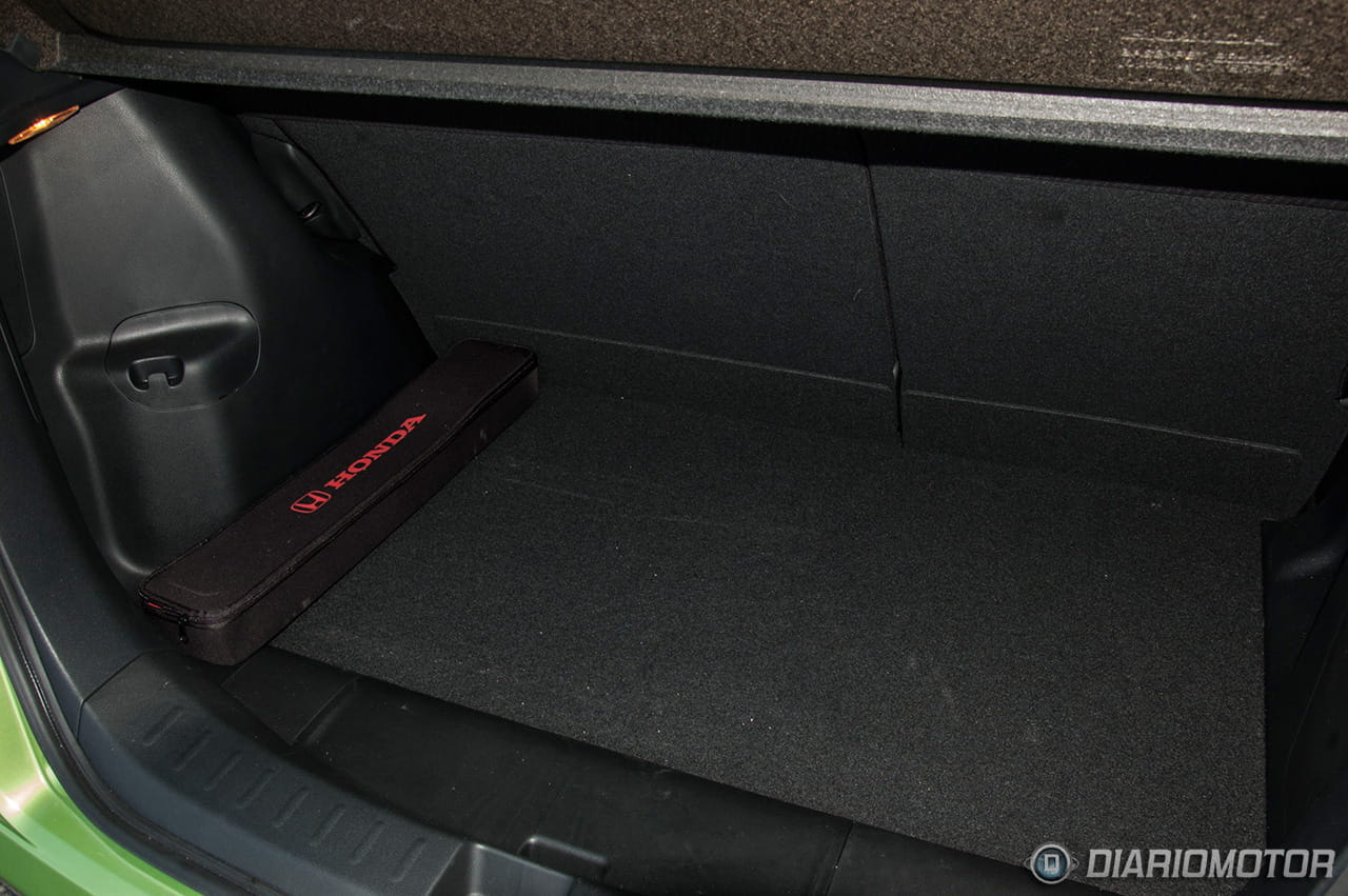 El Honda Jazz cuenta con un maletero repartido en dos espacios, hasta la bandeja cubica 337 litros y en el doble fondo otros 42 litros, que pueden aumentar hasta 64 litros si prescindimos de rueda de repuesto temporal (en sustitución por un kit de reparación de pinchazos). En el caso del Honda Jazz Hybrid el volumen hasta la bandeja se reduce a 300 litros y no existe tal doble fondo, más allá de un pequeño compartimento con una tapa que puede alojar otros 3 litros adicionales. Al plegar los asientos podemos obtener un volumen de 1.320 litros y 1.285 litros hasta el techo para el Honda Jazz y el Hybrid respectivamente, con un suelo completamente plano.