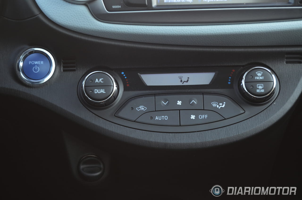 Hora de abordar su interior. Me siento en el puesto de conducción y me empiezo a encontrar con pequeñas pinceladas de azul que nos recuerdan que estamos ante una unidad híbrida. El volante, la tapicería (mixta cuero-tela) o el freno de mano, todos ellos con un acabado en cuero, muestran costuras en azul, al igual que el acabado de la mencionada palanca del cambio automático. Otro cambio que marca la diferencia de esta motorización híbrida es la ausencia de cuentarevoluciones. En su lugar un potenciómetro nos indica si estamos recargando las baterías del Yaris, si estamos llevando a cabo una conducción “Eco” o si por el contrario estamos exigiendo la máxima potencia de su mecánica.