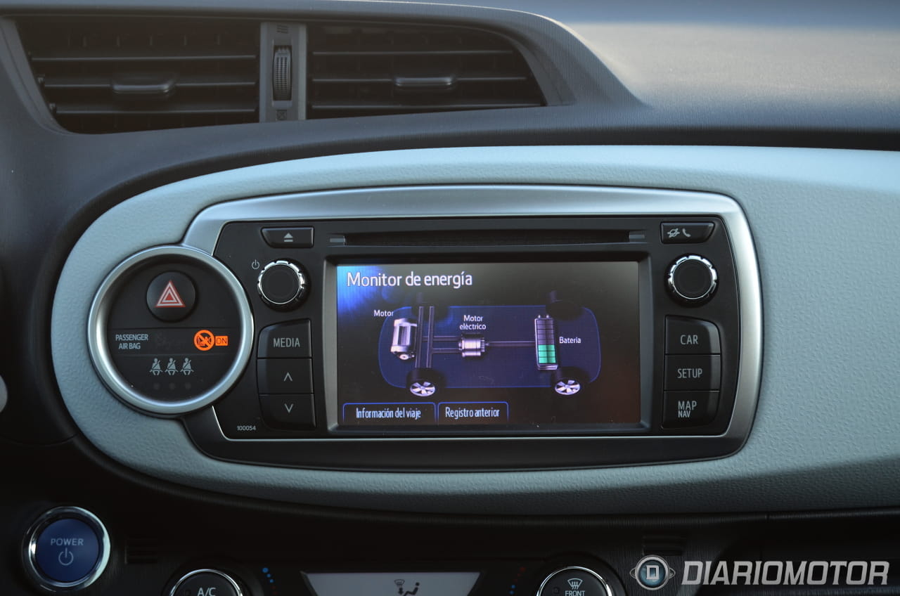 Destaca la combinación entre un tono blanco grisáceo empleado en el eje central del salpicadero y el negro de la parte superior e inferior y por supuesto, no podemos pasar por alto la pantalla táctil de la consola central, a color y desde donde controlamos los parámetros del audio, el navegador o el empleo de la mecánica híbrida, indicándonos en que momento circulamos sólo con el esfuerzo del motor eléctrico, cuando trabajan en conjunto o cuando recargamos las baterías. Lo único malo de esta pantalla es que muestra una interfaz algo desfasada.