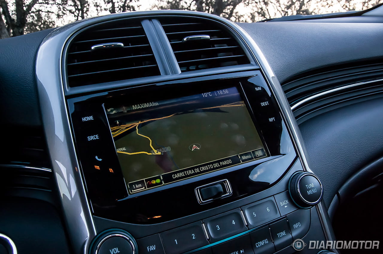 El equipamiento de serie del Chevrolet Malibu LT+ es bastante correcto y ya incluye freno de mano eléctrico, luces diurnas, faros antiniebla delanteros, asientos delanteros con ajustes eléctricos, volante tapizado con piel, indicador de presión de neumáticos, sensor de lluvia e iluminación, control de crucero, climatizador automático, retrovisores térmicos con ajuste eléctrico. También es de serie un navegador con pantalla táctil situado en una posición muy visible y con una interfaz sencilla pero de calidad gráfica mejorable, pecata minuta.