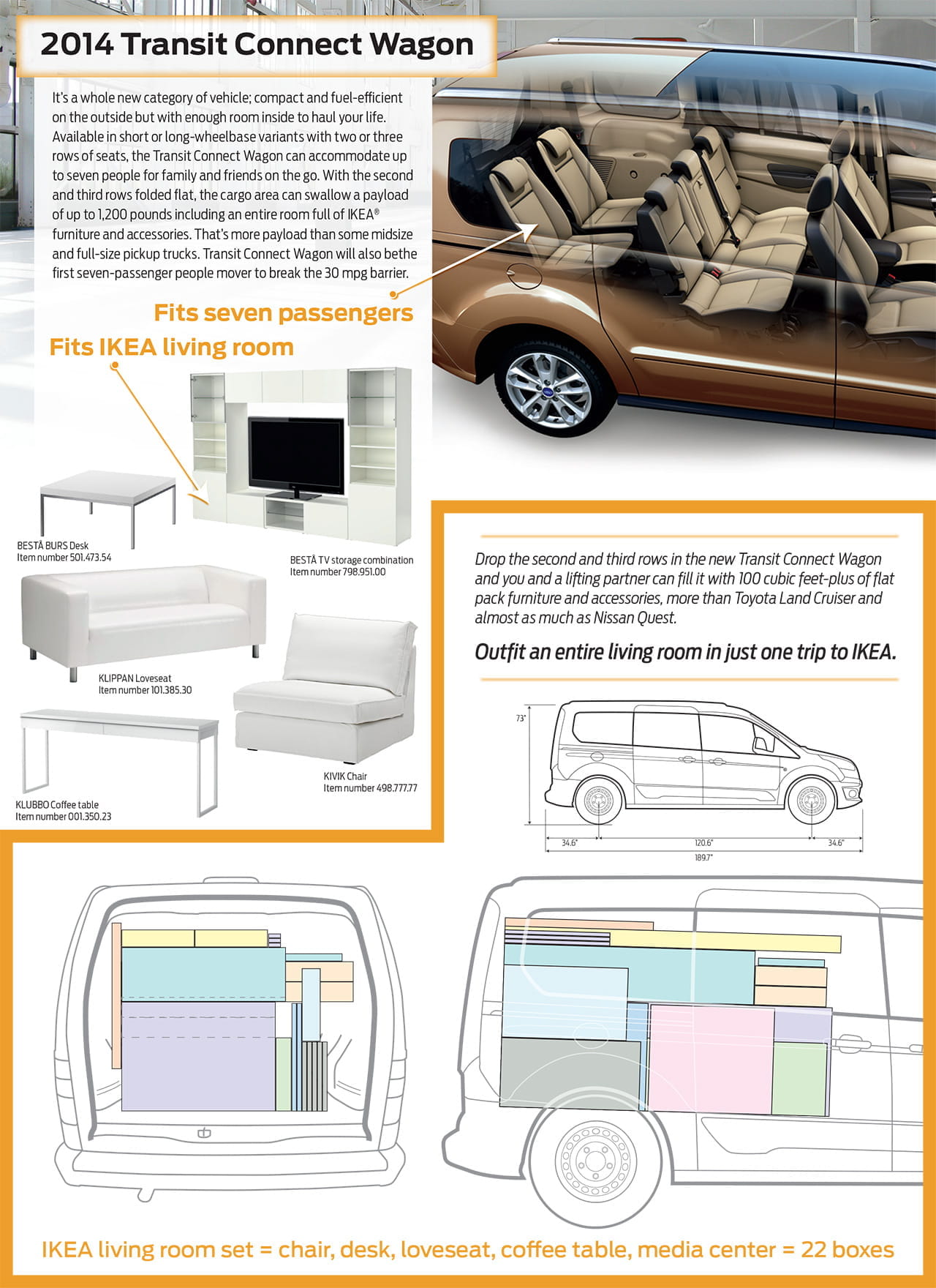 Por último Ford no ha querido perder la oportunidad de colaborar con el famoso constructor de kits de mobiliario sueco, para mostrarnos cómo se puede alojar una sala de estar de IKEA al completo (con sillones, estanterías y vitrinas y mesita de café) en una Ford Grand Tourneo Connect abatiendo las dos filas de sientos posteriores. Lo pueden ver en la siguiente infografía: