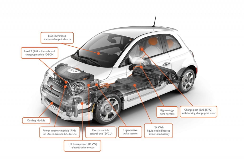 Mecánicamente el Fiat 500e cuenta con un bloque eléctrico de 112 caballos, con un par de 200 Nm y un equipo de baterías de iones de litio. La potencia se entrega a través de las ruedas delanteras, contando con una transmisión automática de una sola relación. La autonomía del Fiat 500e es de 130 kilómetros, mientras que el tiempo necesario para recargarlo en una toma de 240 voltios es de 4 horas.