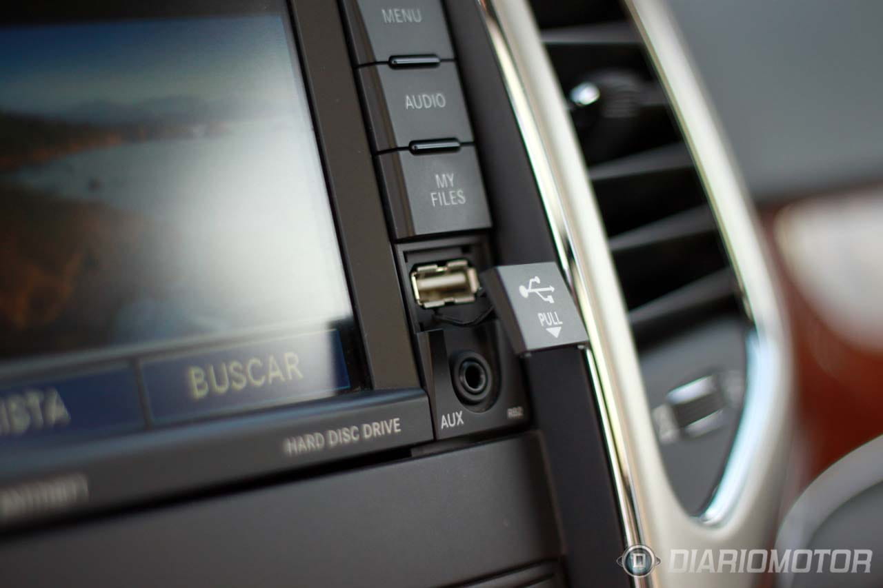 La conectividad que ofrece el sistema es completa. Cuenta con un disco duro interno de 30 GB capaz de almacenar toda la música necesaria para no repetir canción en meses. Para alimentarlo, existe con una conexión frontal USB a través de la que podremos descargar fácilmente todos nuestros archivos de música desde una memoria externa. El USB que se encuentra bajo el reposabrazos delantero no parecía conectado con el equipo en la unidad de prueba, aunque sí permitía la recarga de de la batería de mi móvil. Por su parte, la compatibilidad con un iPod, en teoría posible, fue nula.