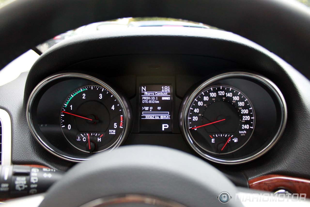 Después de “escalar” hasta el asiento sin ayuda de estribos, nos recibe un interior en el que cuero y madera predominan en un primer vistazo. La gran amplitud llama también la atención poderosamente, tanto en las plazas delanteras como en las traseras. Parece que las generosas dimensiones exteriores se han traducido en espacio útil, cosa que no siempre hay que dar por supuesta pero sí se ha logrado en este caso. Punto para Jeep.