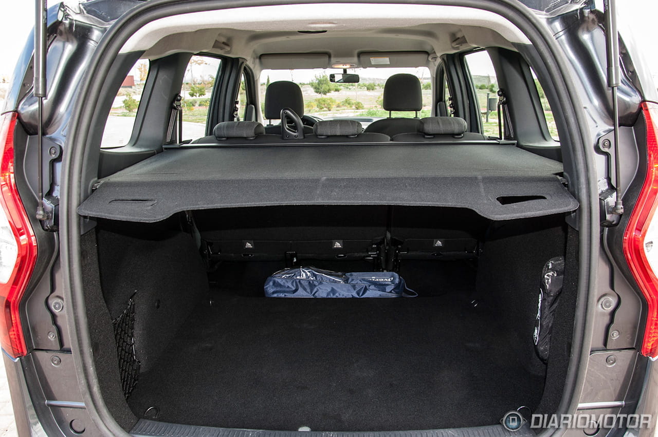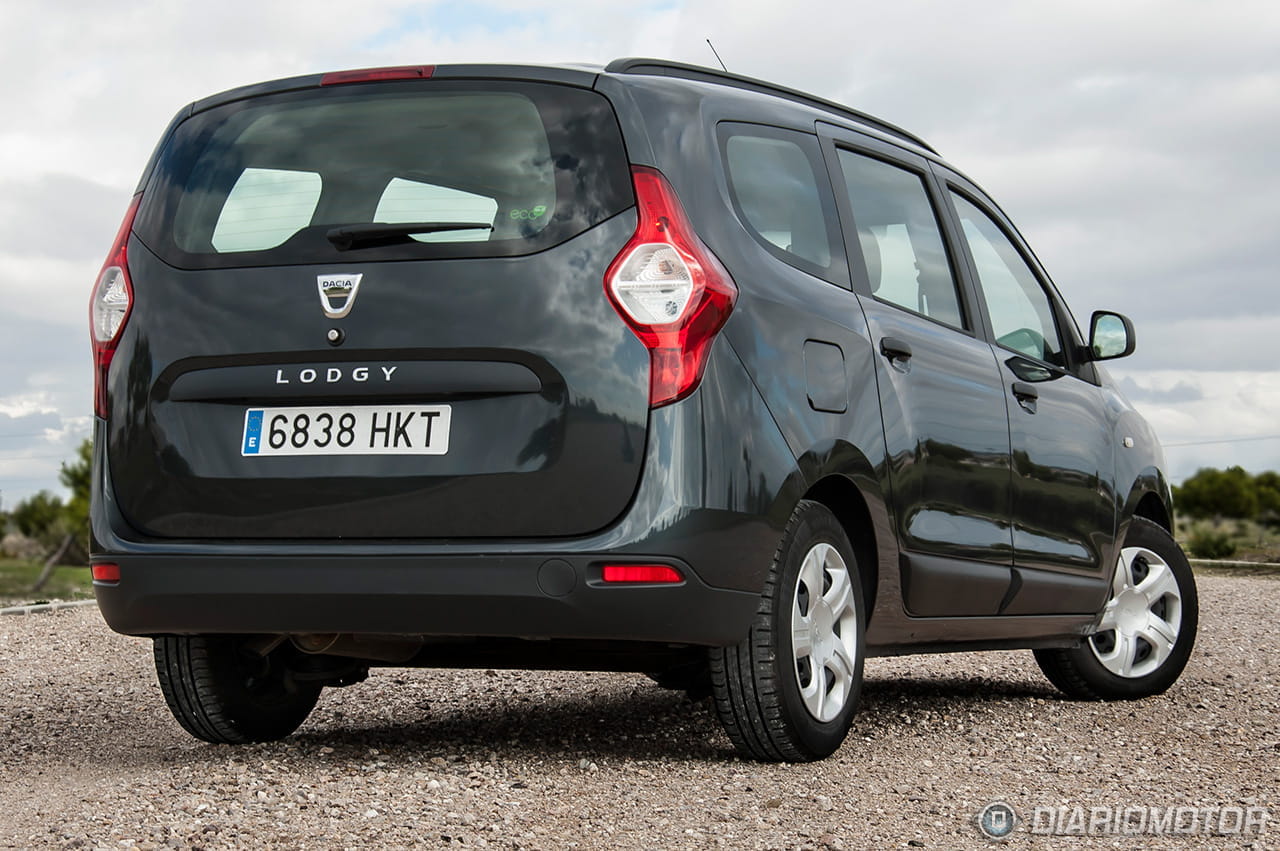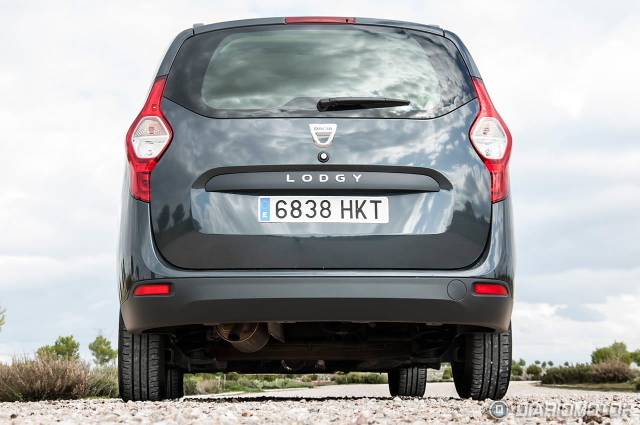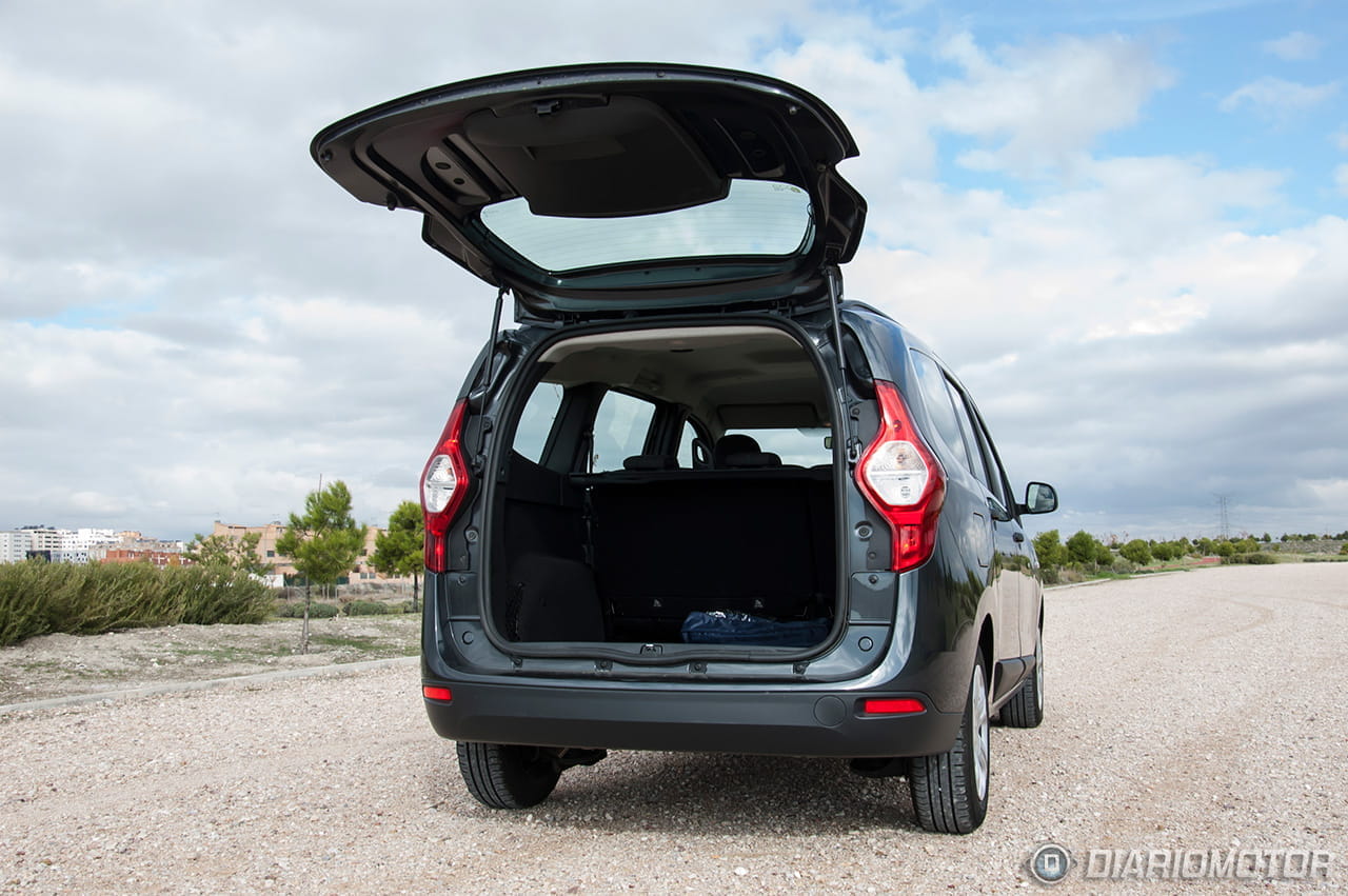 La principal virtud del Dacia Lodgy está en su maletero. El acceso al espacio de carga se practica por un gran portón trasero de apertura vertical, que no se abre desde la llave-mando a distancia sino desde un botón visible en el propio portón. El tamaño de la puerta es considerable y requiere tener ciertos cuidados en garajes cerrados con techo bajo. La boca de carga es bastante baja y prácticamente solidaria a ras del suelo del maletero. Por 102 euros se ofrece opcionalmente una red de retención de equipaje.