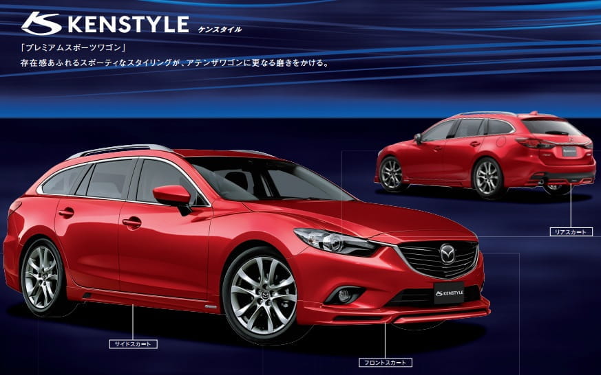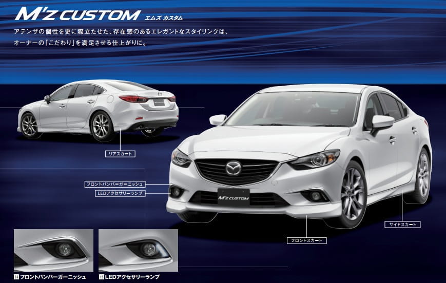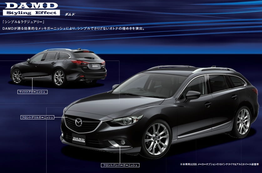 Para el desarrollo de estos tres paquetes de accesorios para el nuevo Mazda 6, los de Hiroshima han recurrido a tres preparadores de confianza: DAMD Styling Effect, Kenstyle y M’z Custom para los correspondientes Mazda Atenza Racer 2013, Mazda Atenza GT Sound Special 2013 y Mazda Atenza Wagon Grand Touring 2013.