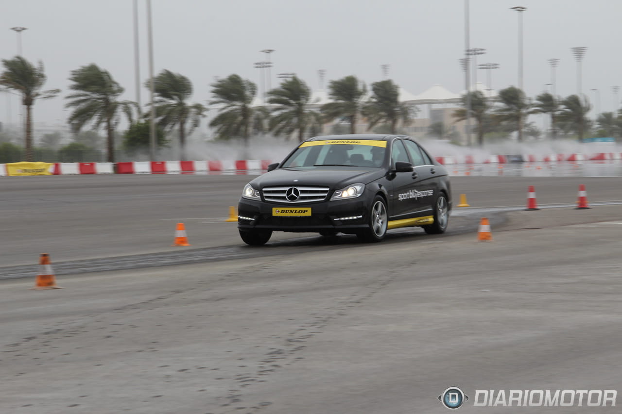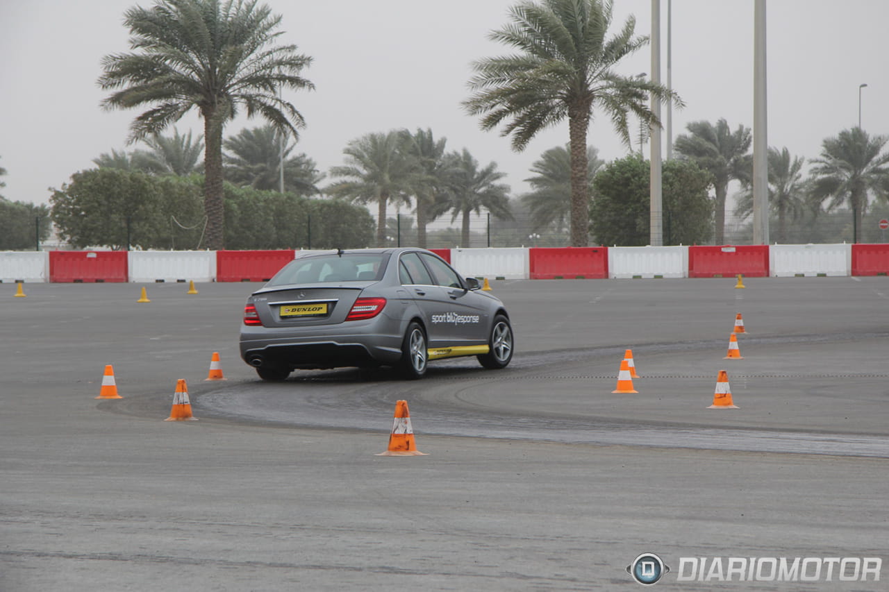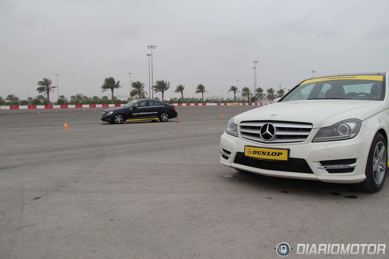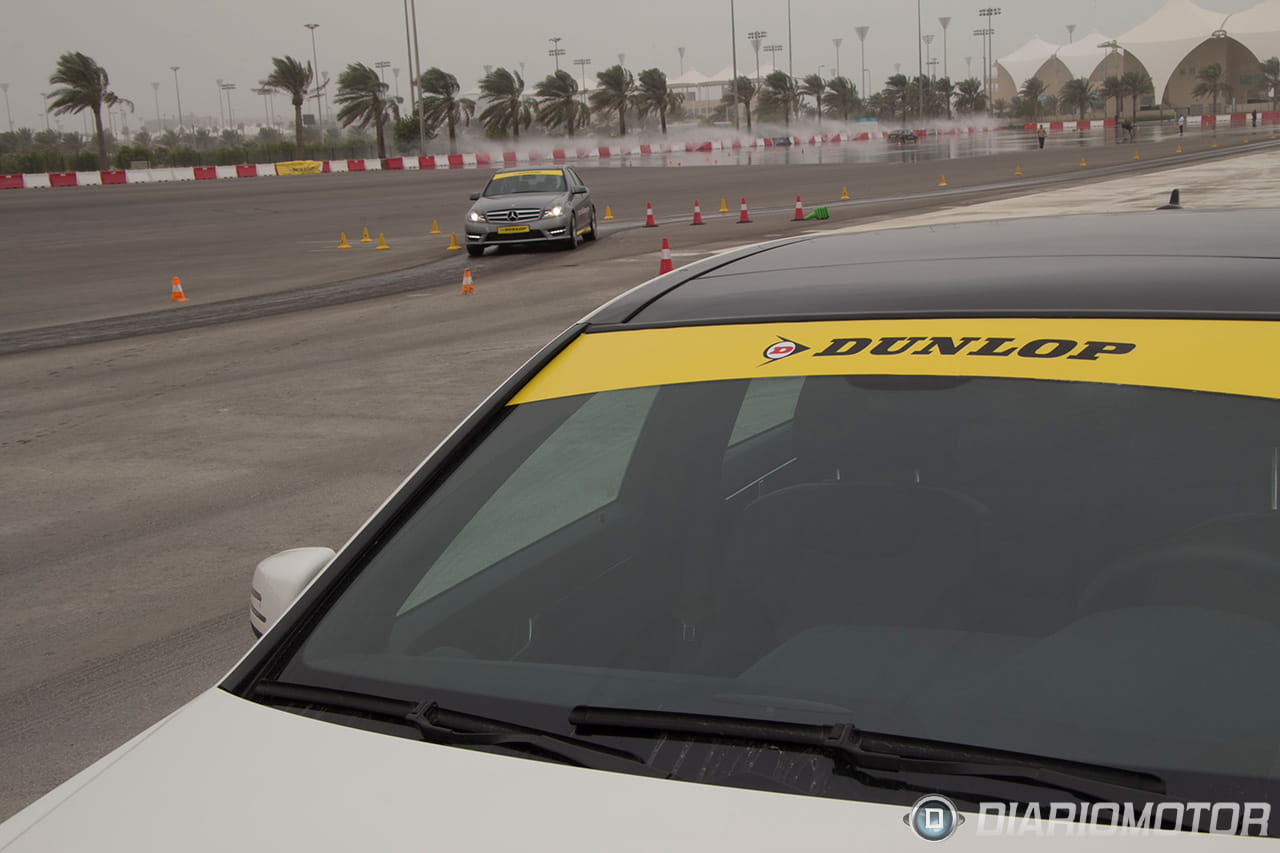 La primera prueba que realizamos consistía en un pequeño circuito con curvas en seco y mojado. A bordo de un Mercedes Clase C pudimos comprobar el buen agarre en ambos casos. Realmente es fácil determinar si un neumático agarra bien o no: basta con coger una curva cerrada en mojado a una velocidad que nunca haríamos en carretera. Si el neumático derrapa (y el ESP salta), el agarre no sería del todo bueno. Si por el contrario se produce un subviraje leve y progresivo, y por tanto controlable, podemos decir que el neumático está actuando de forma correcta.